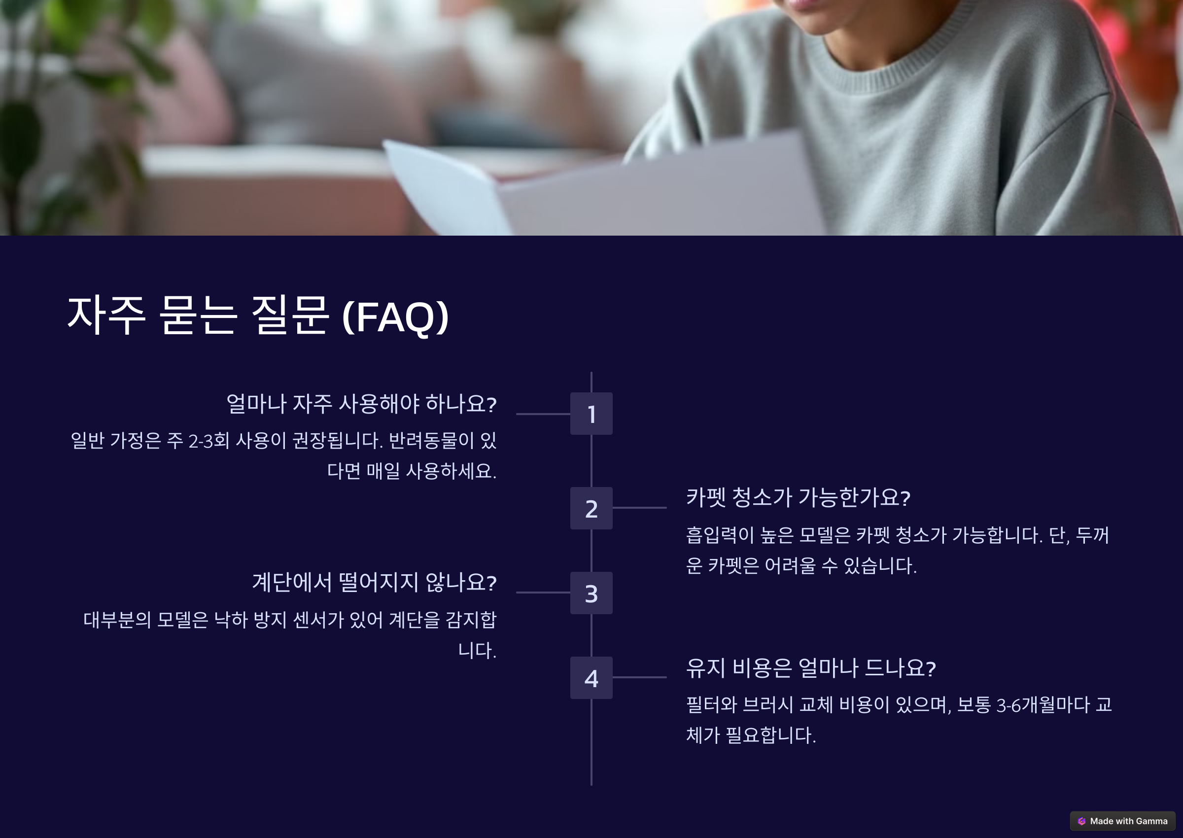A3. 먼지통은 주 1~2회 비워주고, 브러시와 필터는 정기적으로 청소해야 해요. HEPA 필터는 3~6개월마다 교체하는 게 좋아요.