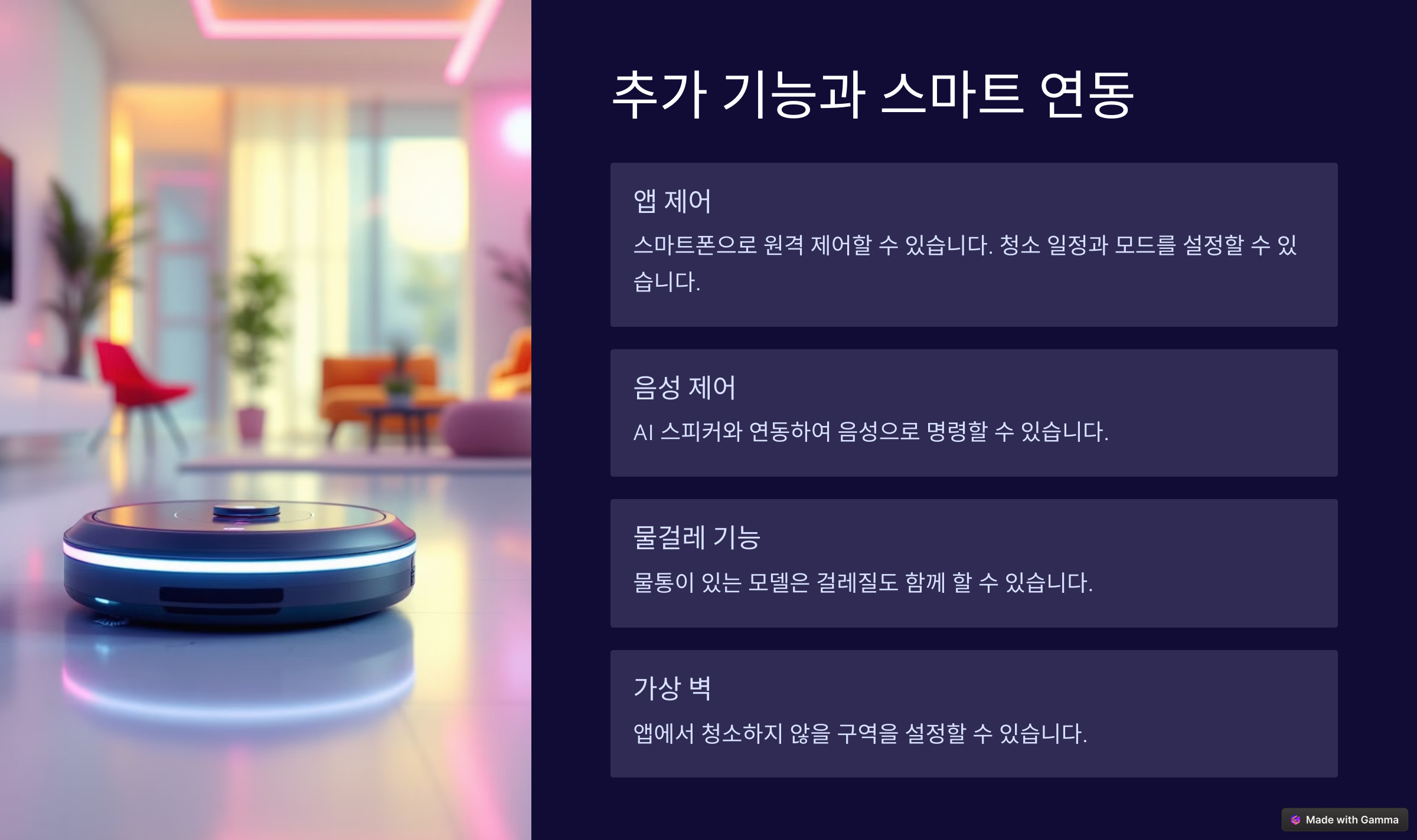 이 외에도 물걸레 기능이 있는지, 앱 연동이 가능한지 등 추가적인 기능도 체크해보는 것이 좋아요! 🚀