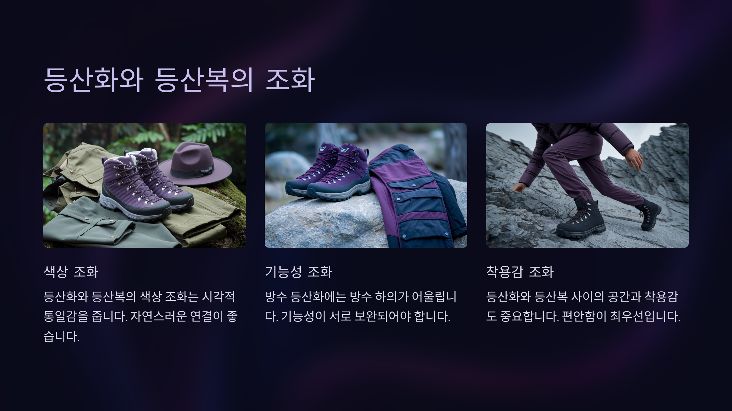 등산복을 잘 갖춰 입어도 신발이 불편하면 등산이 힘들어질 수 있어요. 등산화는 지형과 난이도에 맞게 선택해야 하며, 착용감과 안전성을 고려하는 것이 중요해요. 등산복과의 조화도 신경 써야 최상의 등산 경험을 할 수 있어요.
