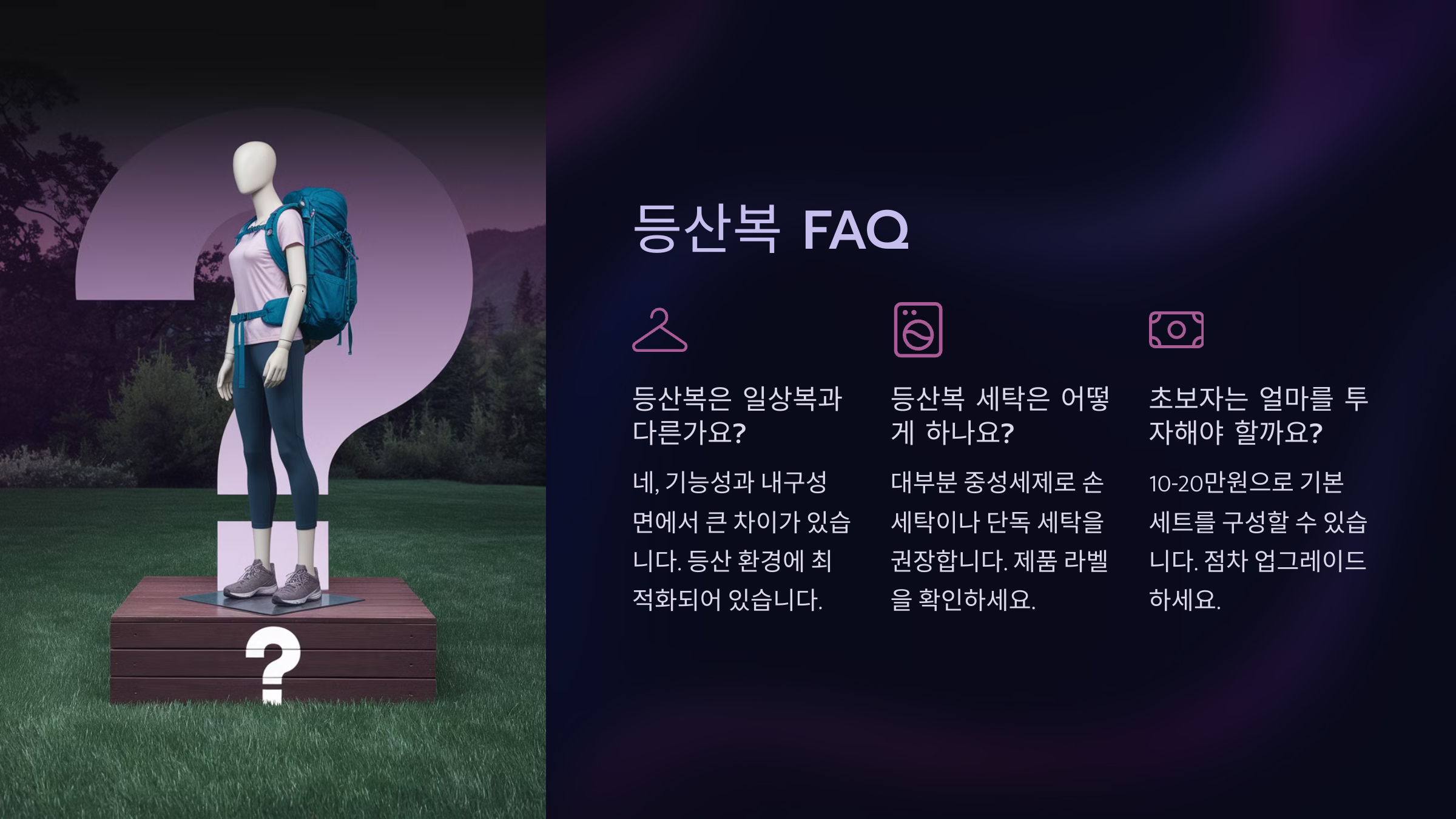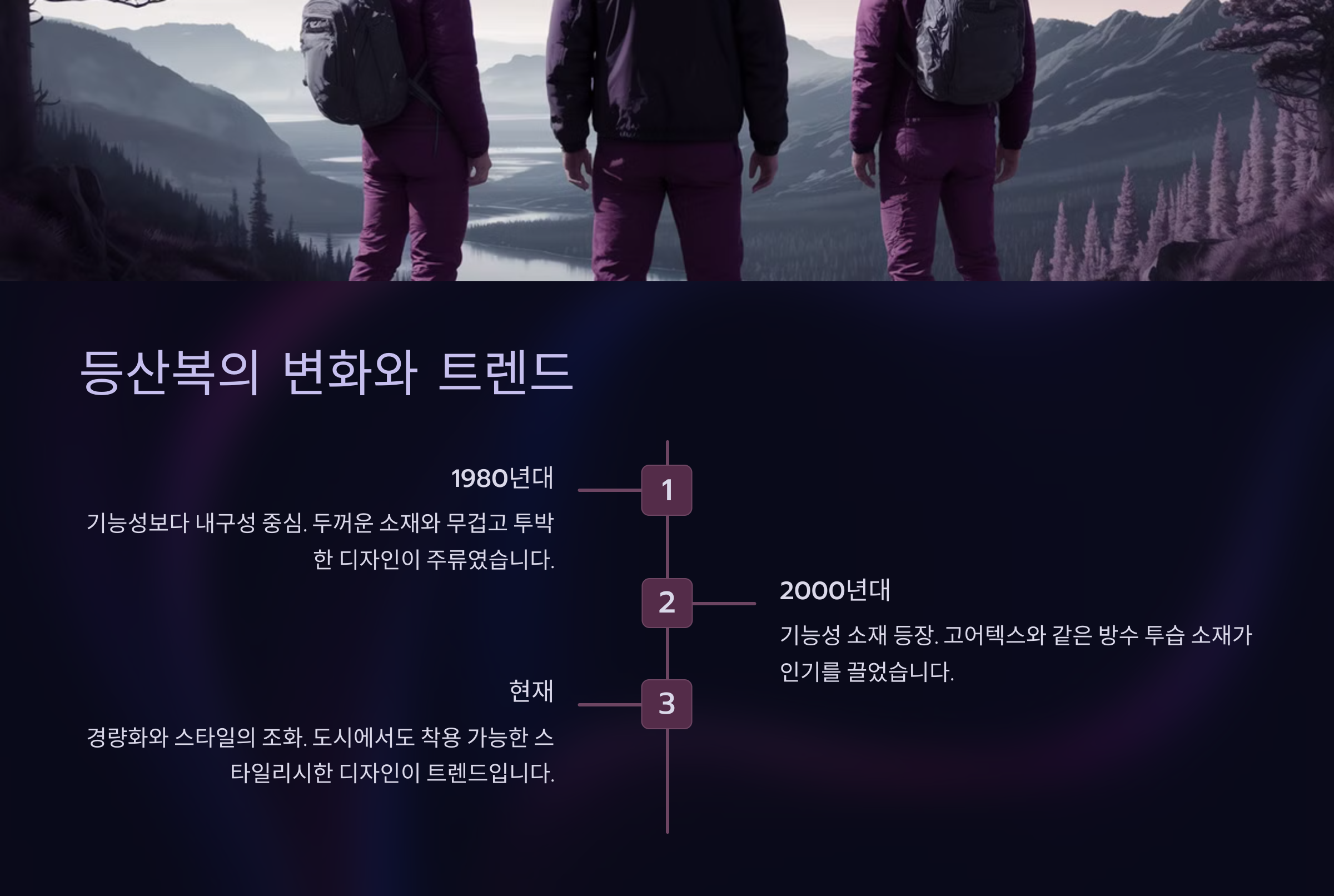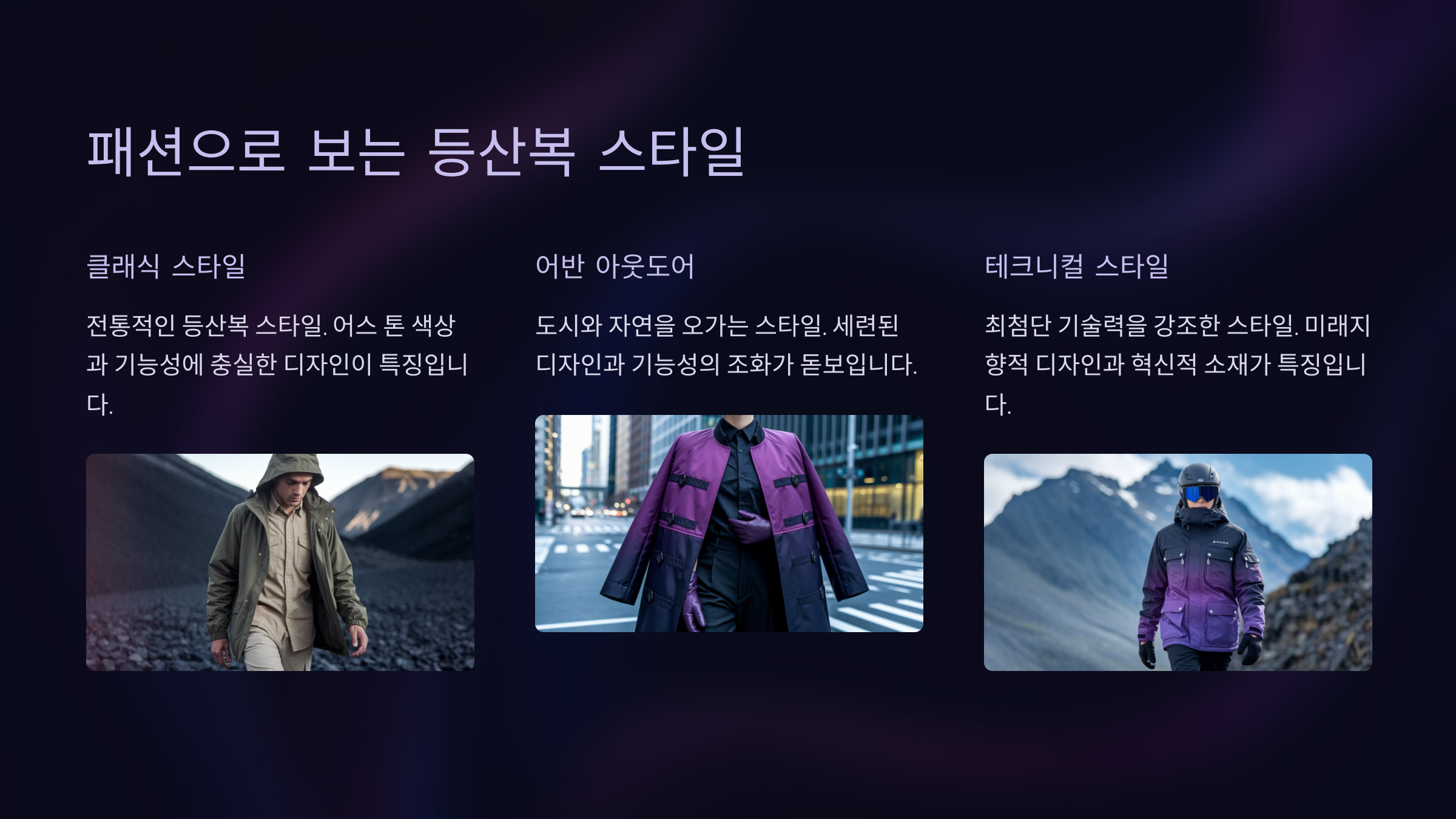 | 클래식 아웃도어 | 전통적인 등산복 스타일, 기능성 최우선 | 장거리 등산, 전문가 |