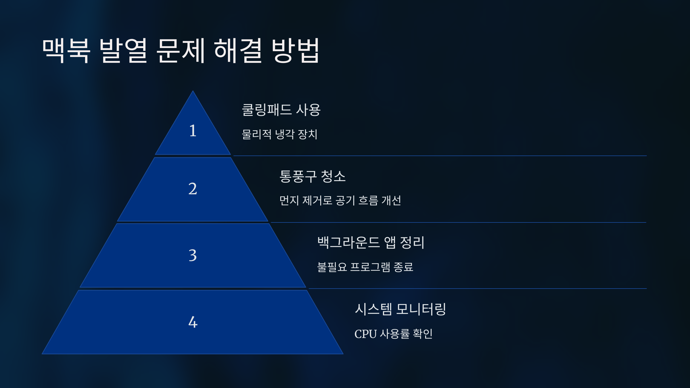 💡 쿨링 패드 활용: 외부 팬이 달린 쿨링 패드를 사용하면 맥북의 발열을 효과적으로 줄일 수 있어요.