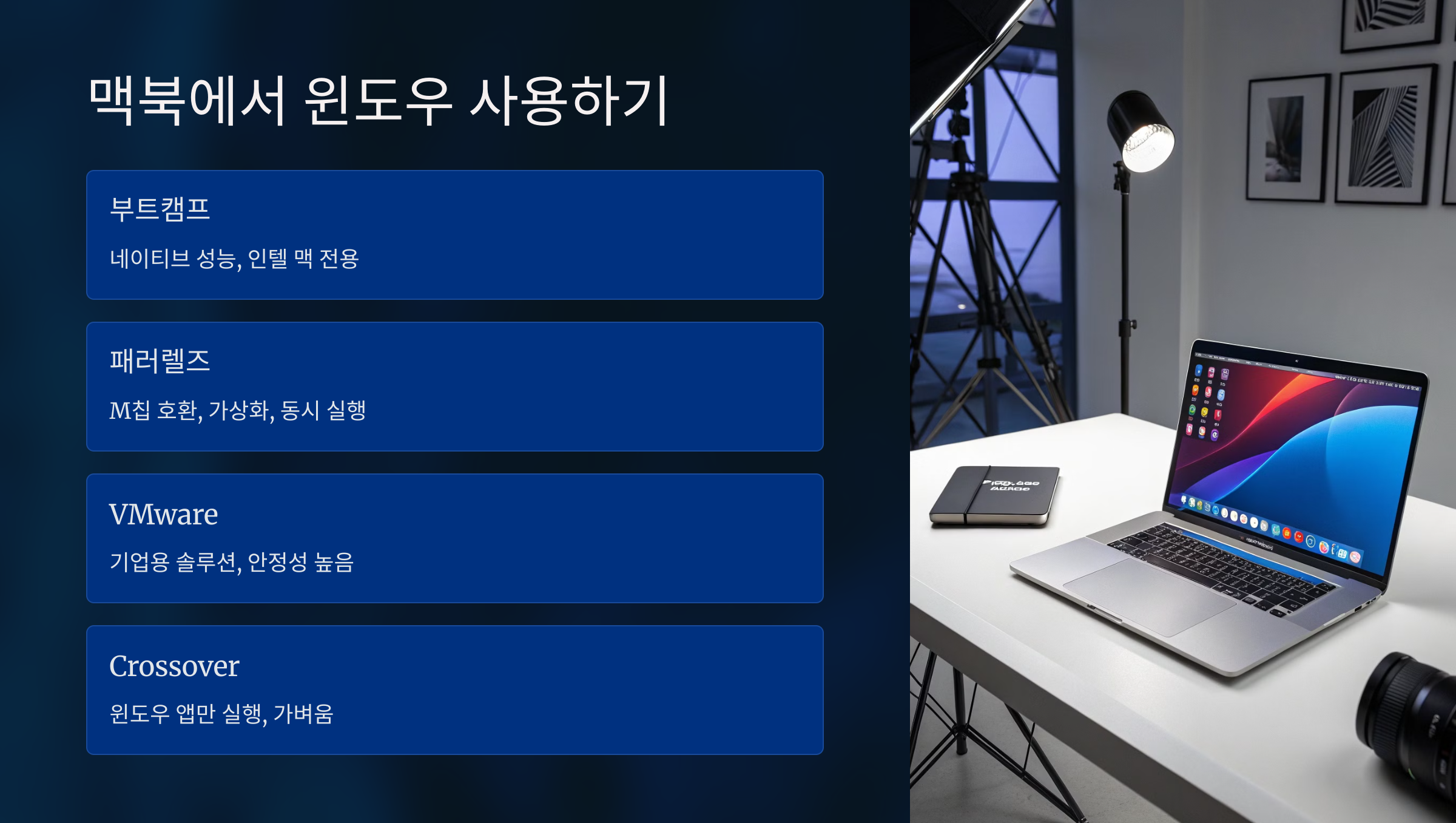 맥북을 쓰면서도 윈도우가 필요할 때가 있어요. 특히 윈도우 전용 프로그램을 사용해야 할 경우 고민되죠. 맥북에서 윈도우를 사용하는 방법은 크게 두 가지가 있어요: 부트캠프와 가상화 프로그램이에요.