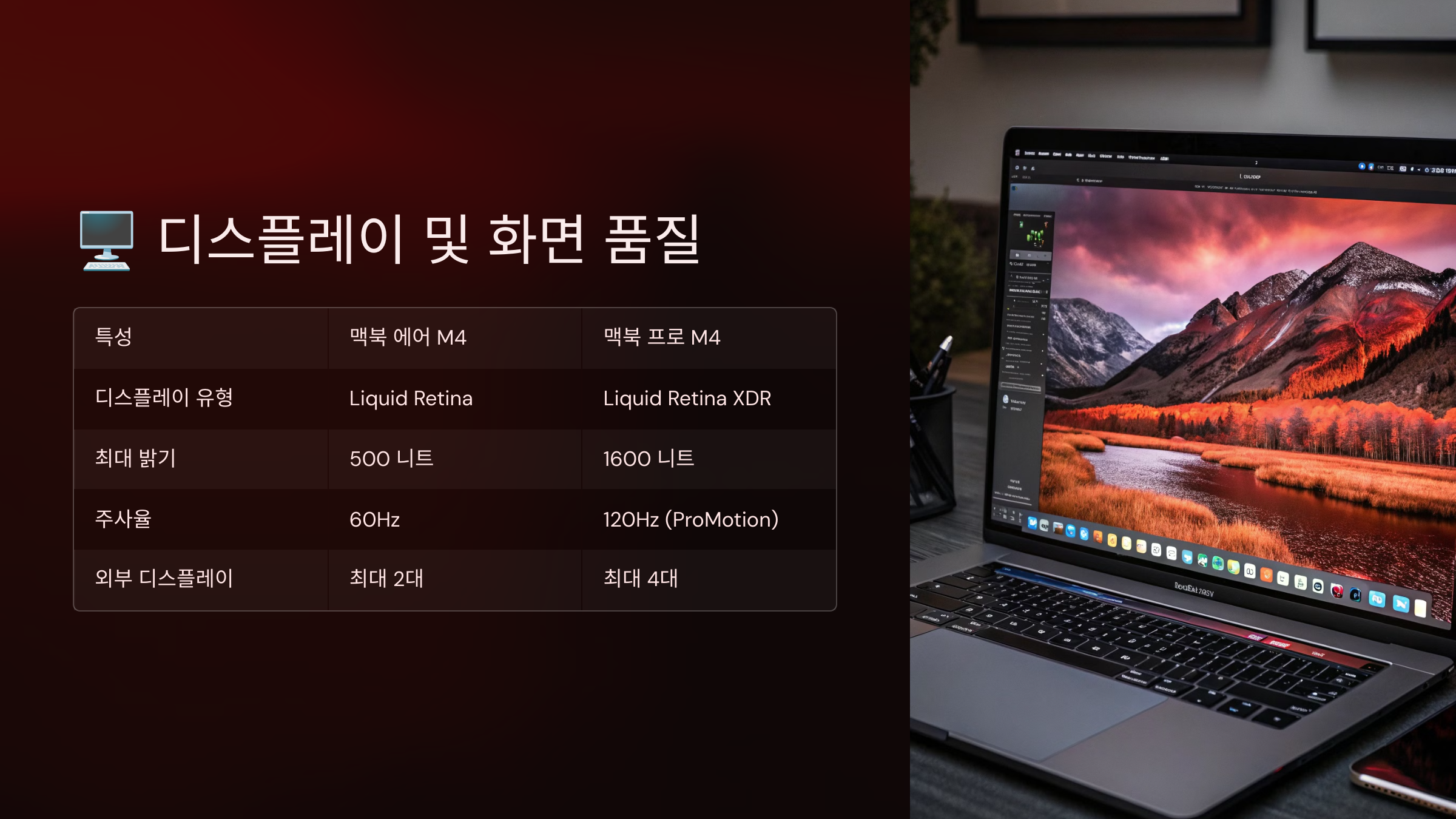 맥북 프로 M4와 맥북 에어 M4의 디스플레이도 상당한 차이가 있어요. 맥북 프로 M4는 XDR 미니 LED 디스플레이를 탑재해 HDR 콘텐츠 감상 및 색 정확도가 뛰어나요. 반면, 맥북 에어 M4는 Liquid Retina 디스플레이를 사용해 선명하지만 프로급 색재현력은 맥북 프로에 비해 약간 부족할 수 있어요.