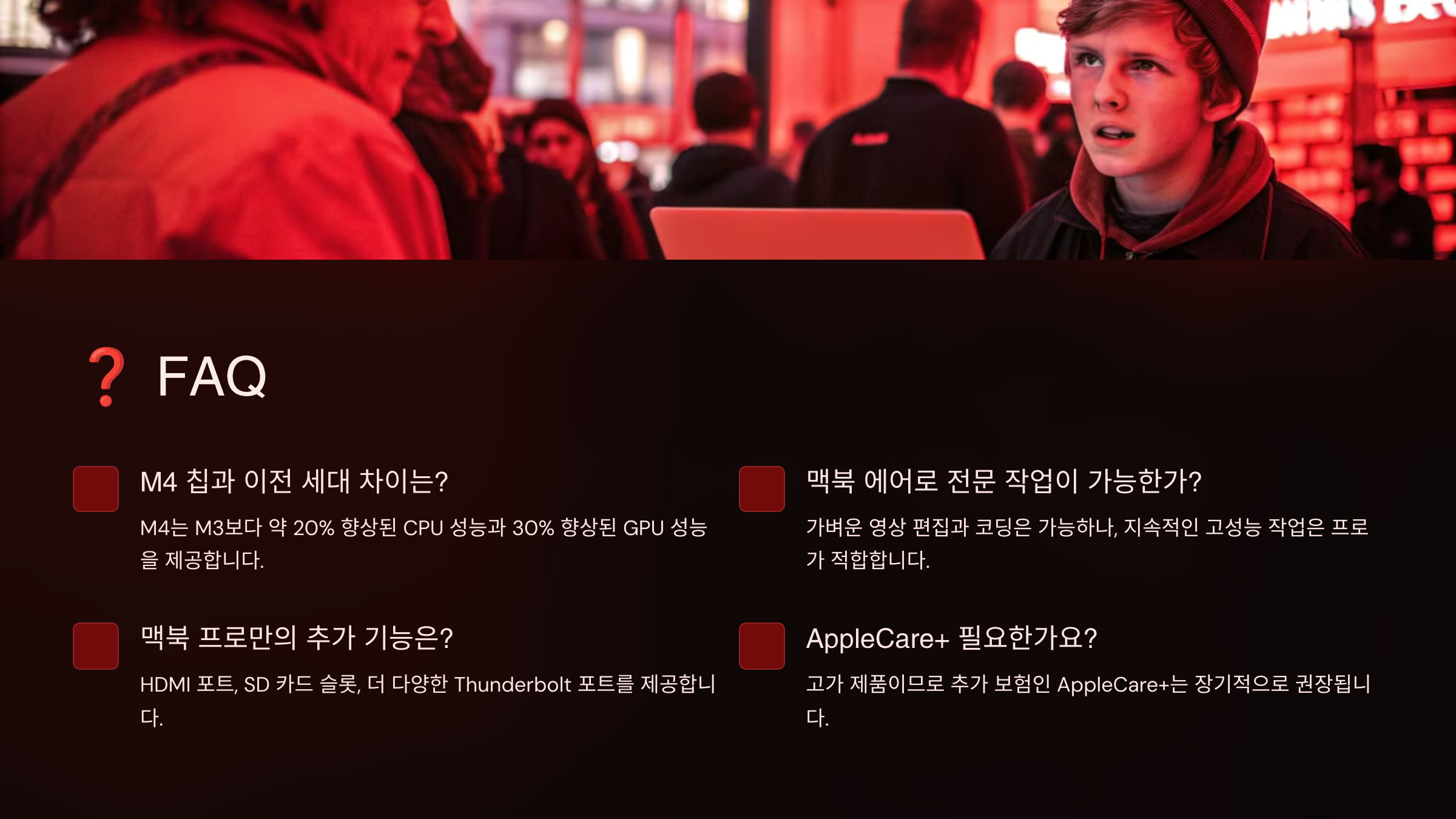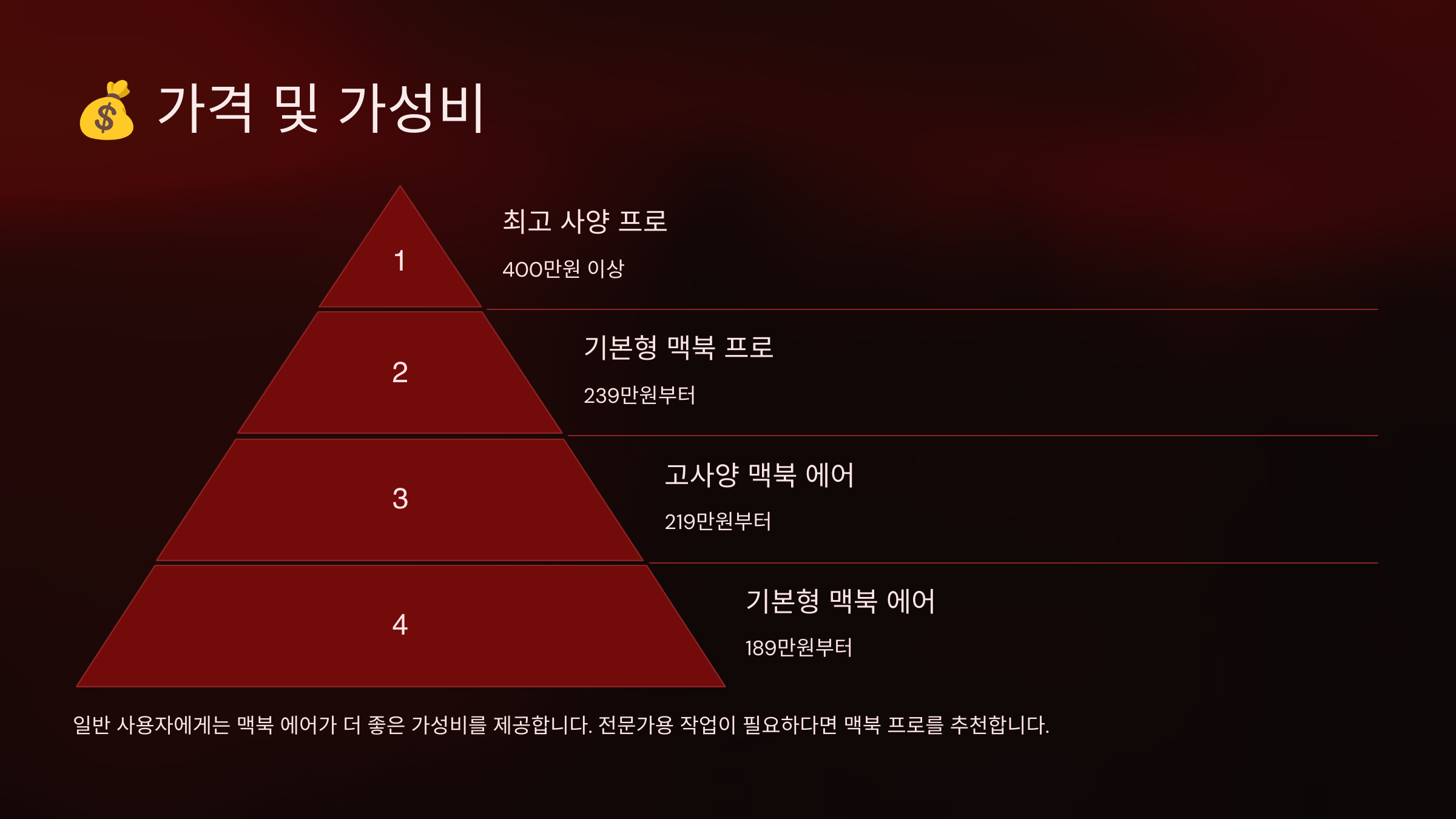 A1. 사용 용도에 따라 다릅니다! 전문가 작업용이면 맥북 프로 M4, 가성비와 휴대성을 원하면 맥북 에어 M4가 좋아요.