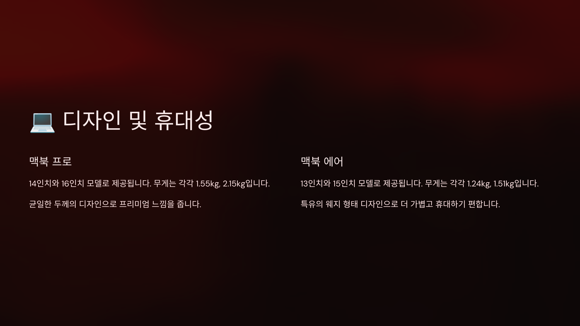 맥북 프로는 두께가 두껍지만 알루미늄 유니바디 디자인으로 견고한 느낌을 주며, 미니 LED 디스플레이가 적용되어 화면 품질이 뛰어나요. 반면, 맥북 에어는 여전히 얇고 슬림한 형태로 휴대성이 우수해요.