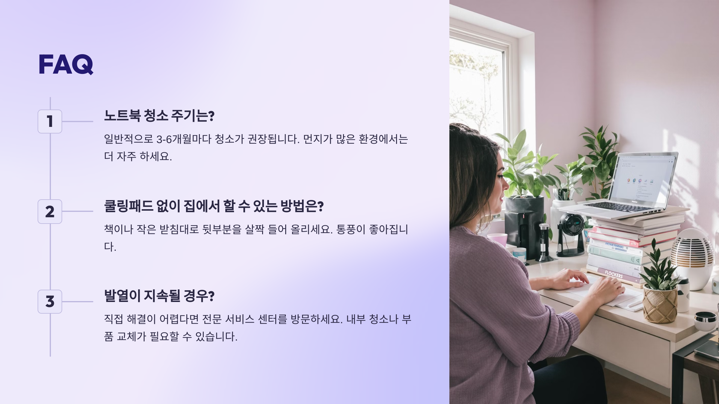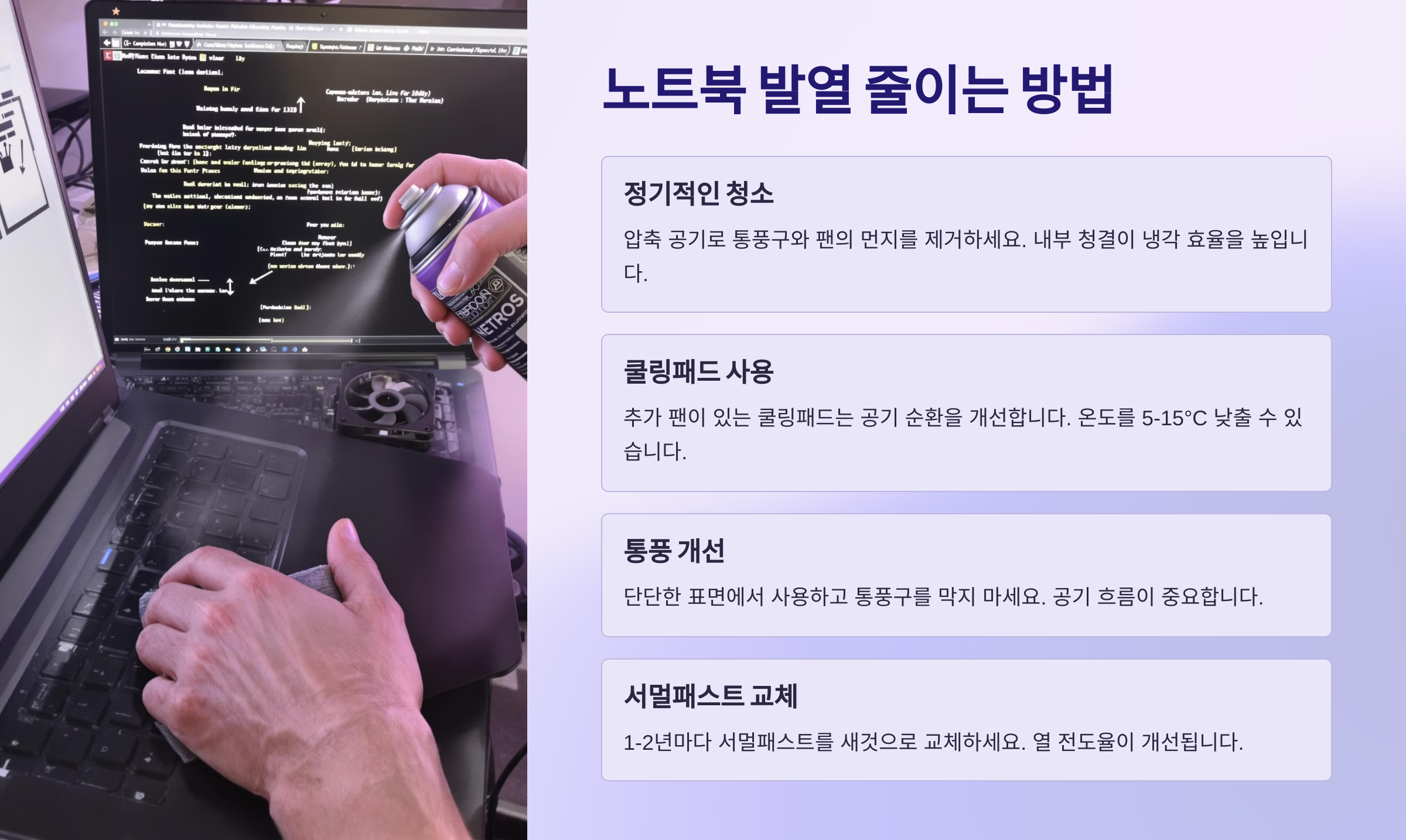 이제 발열 문제를 어떻게 해결할 수 있는지 알아볼까요? 노트북을 시원하게 유지하는 효과적인 해결법을 소개해 드릴게요. ❄️