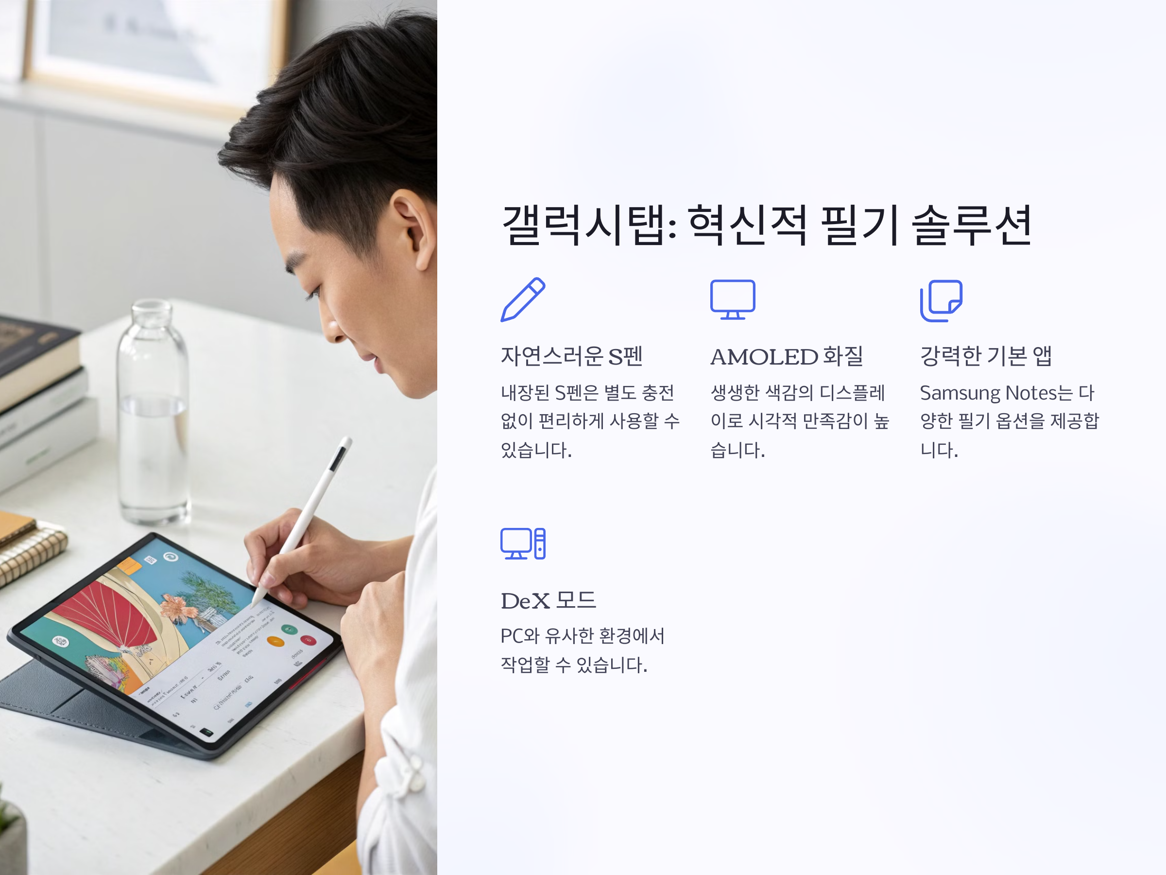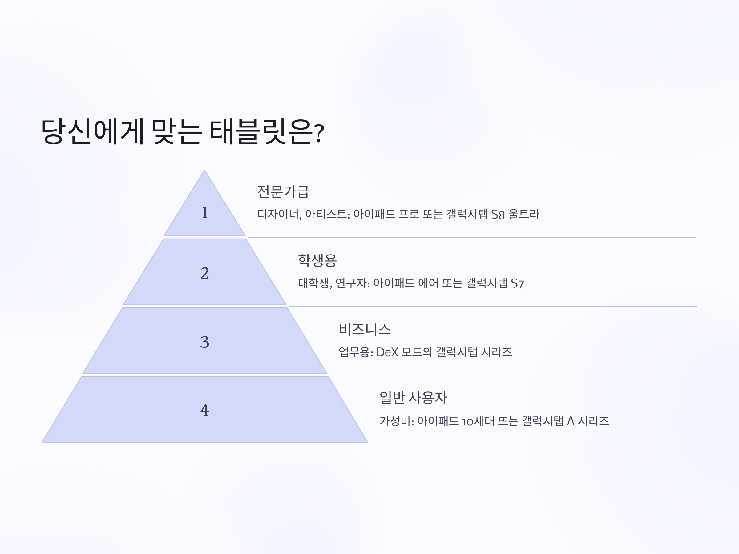 | 직장인 | 아이패드 Pro / 갤럭시탭 S9+ | 회의록 작성 및 멀티태스킹 용이 |