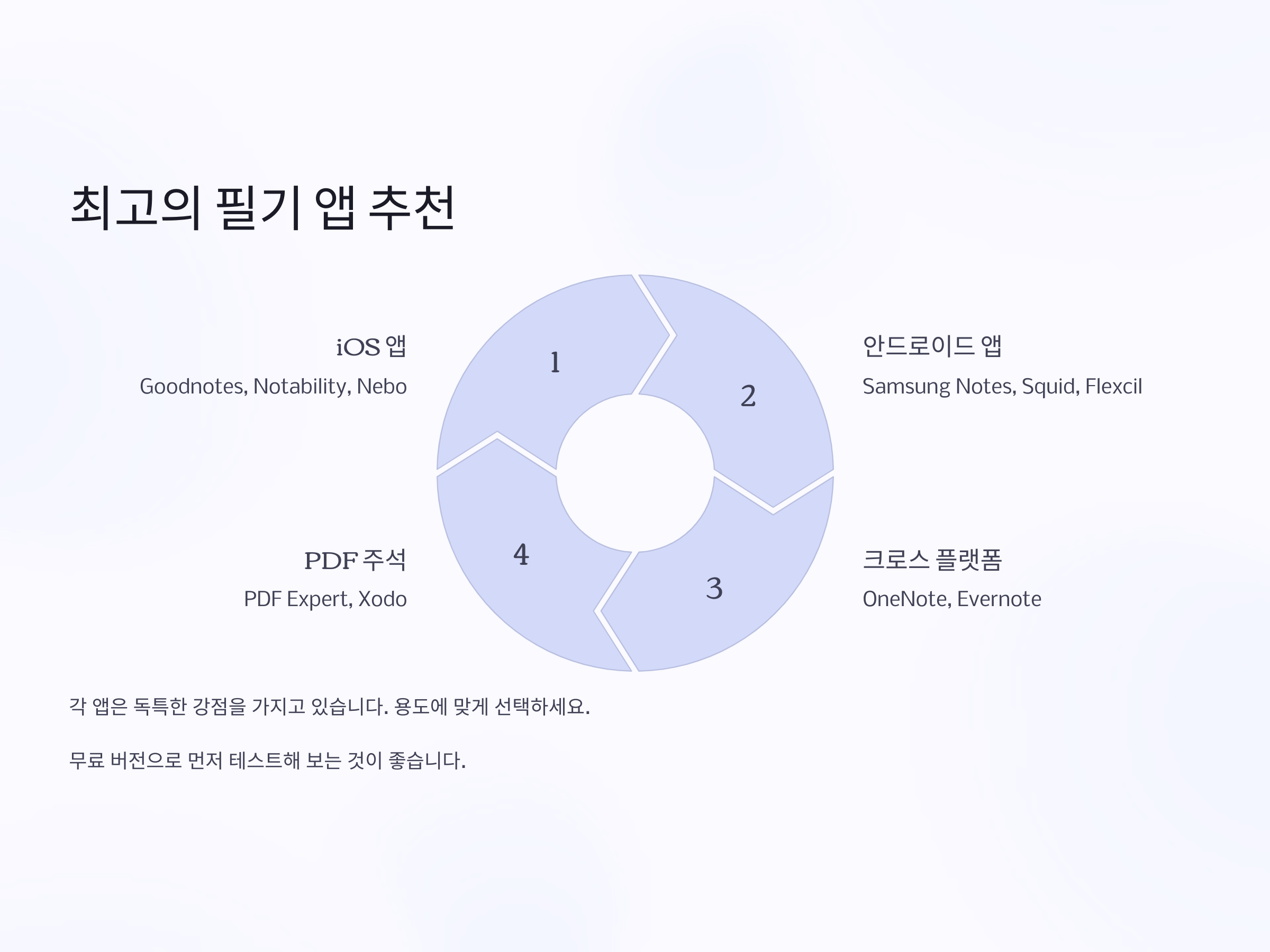 태블릿을 더 효율적으로 사용하려면 좋은 필기 앱이 필수예요! 아래는 아이패드와 갤럭시탭에서 사용할 수 있는 필기 앱 추천 리스트입니다. 📝