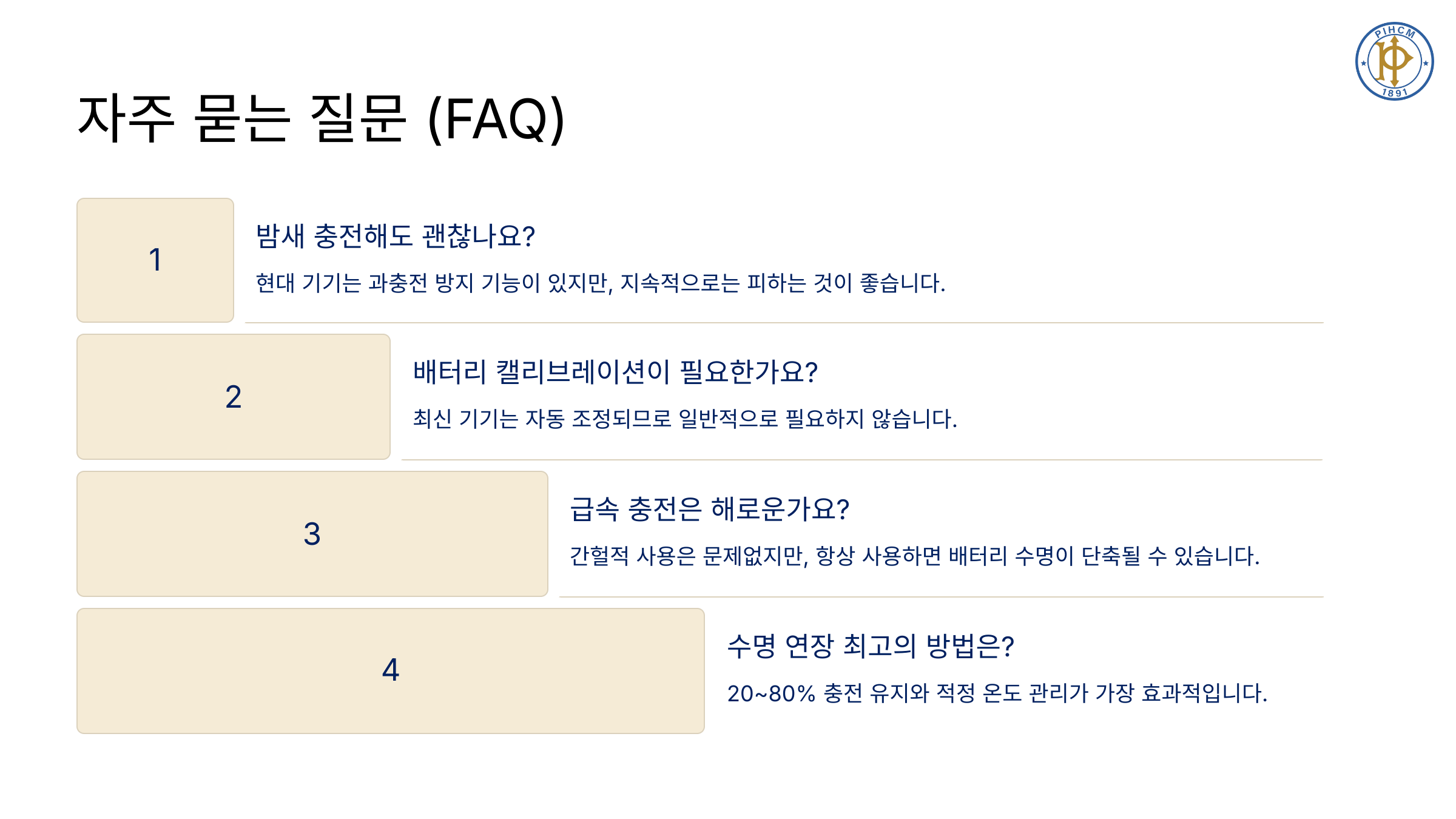 A5. 100% 충전을 자주 하면 배터리 수명이 단축될 수 있어요. 20~80% 사이에서 충전하는 것이 가장 좋아요.