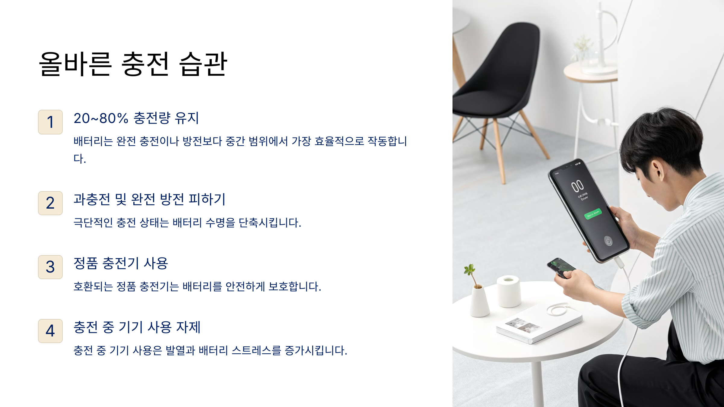 배터리를 100%까지 충전하거나 0%까지 방전시키는 습관은 좋지 않아요. 20~80% 범위를 유지하는 것이 배터리 건강에 가장 좋아요.