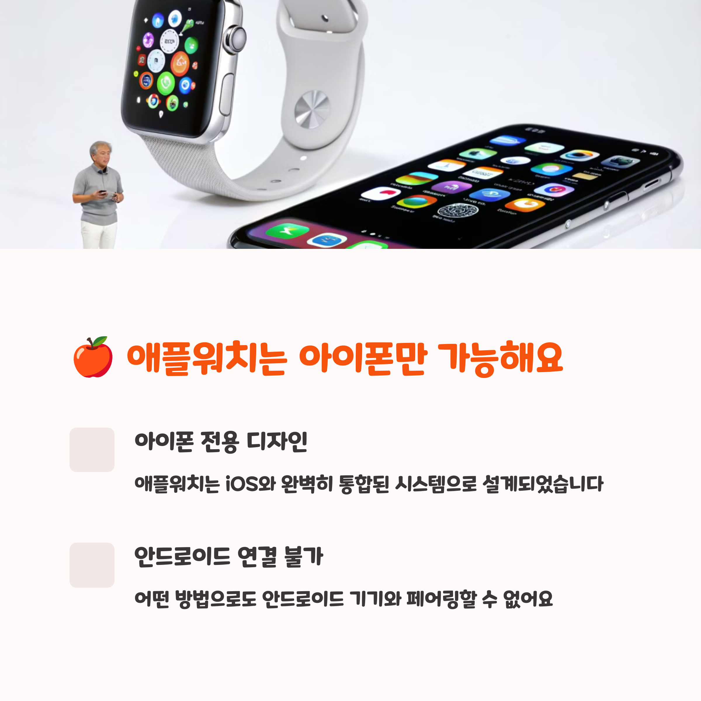 애플워치는 출시 이후 지금까지 오직 아이폰 사용자만 사용할 수 있도록 설계돼 있어요. 애플은 자사의 제품 생태계를 철저하게 통제하는 전략을 고수해왔고, 애플워치도 그 일환이에요. 안드로이드 스마트폰에서는 블루투스 연결은 될지 몰라도 실질적인 기능 사용은 불가능하죠.