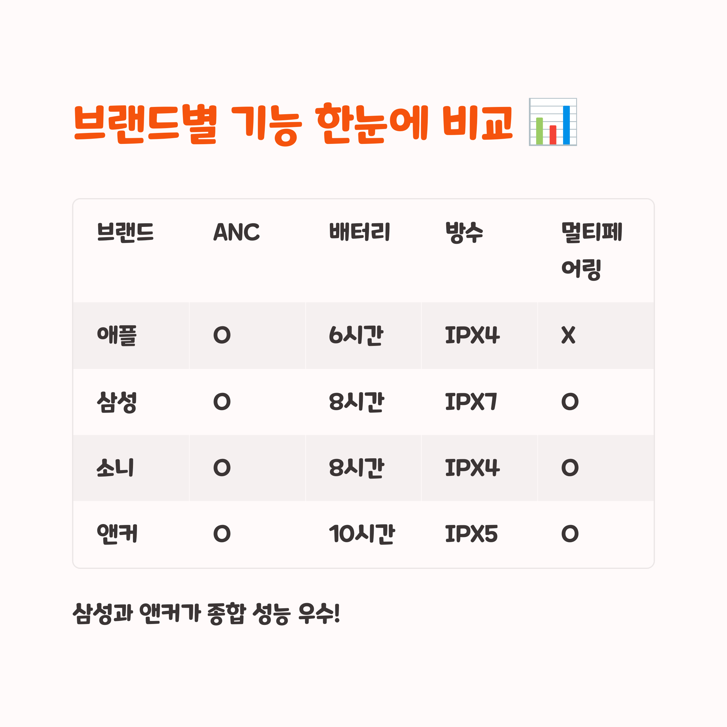 여러 브랜드의 무선 이어폰을 비교해보면, 각 제품마다 특화된 포인트가 뚜렷해요. 어떤 건 통화 품질이 뛰어나고, 어떤 건 배터리 지속 시간이 길거나 음질이 더 선명하죠. 이럴 땐 브랜드별 스펙을 표로 정리해서 보면 선택이 쉬워져요!