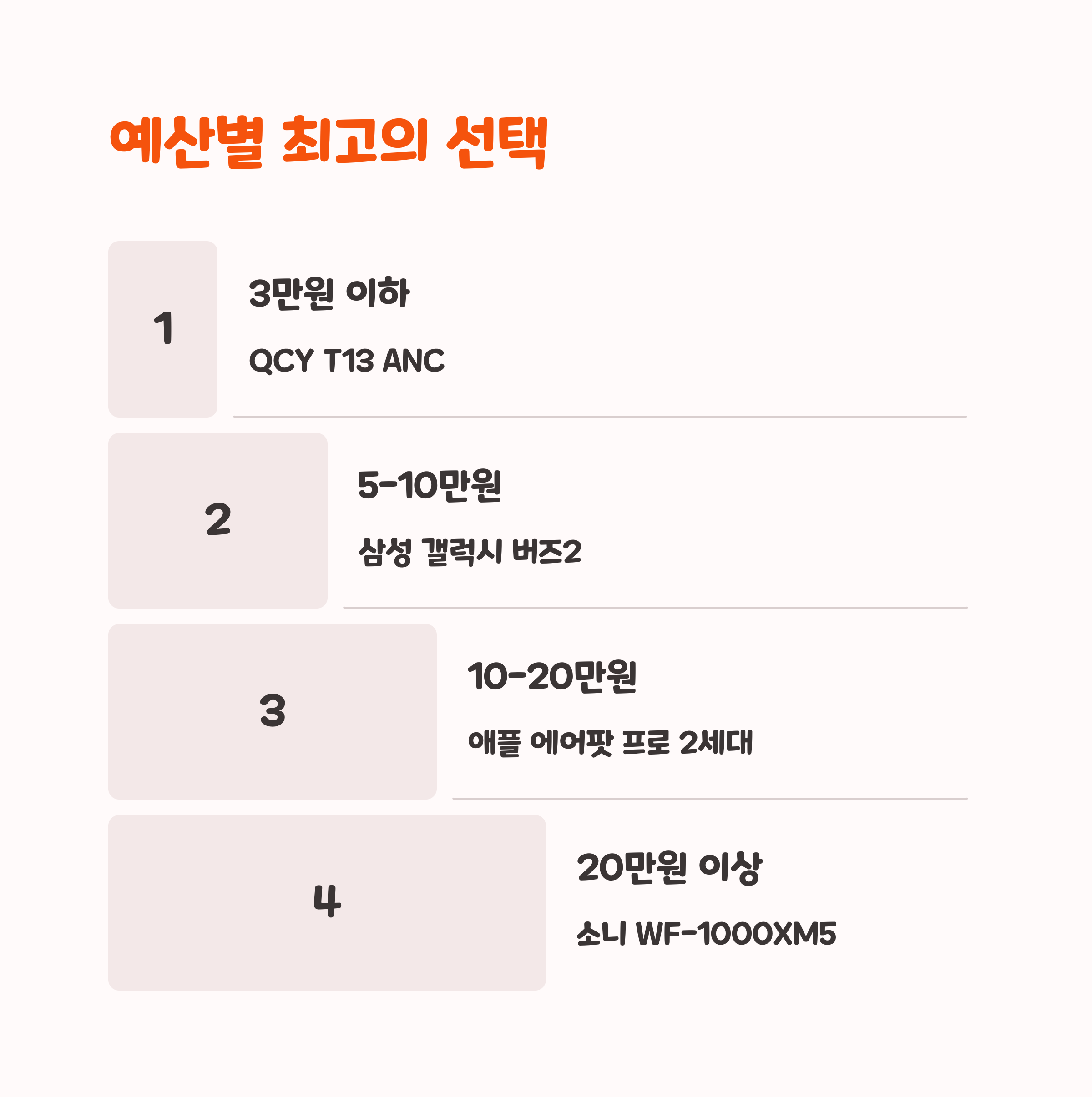 이제 가격대별로 어떤 통화용 무선 이어폰이 가장 효율적인지 정리해볼게요! 🎧💬 통화 품질을 기준으로 성능 대비 가격이 좋은 제품들을 세 구간으로 나눠 소개해드릴게요. 이 구성대로 보시면 예산에 따라 최적의 선택이 가능해요.