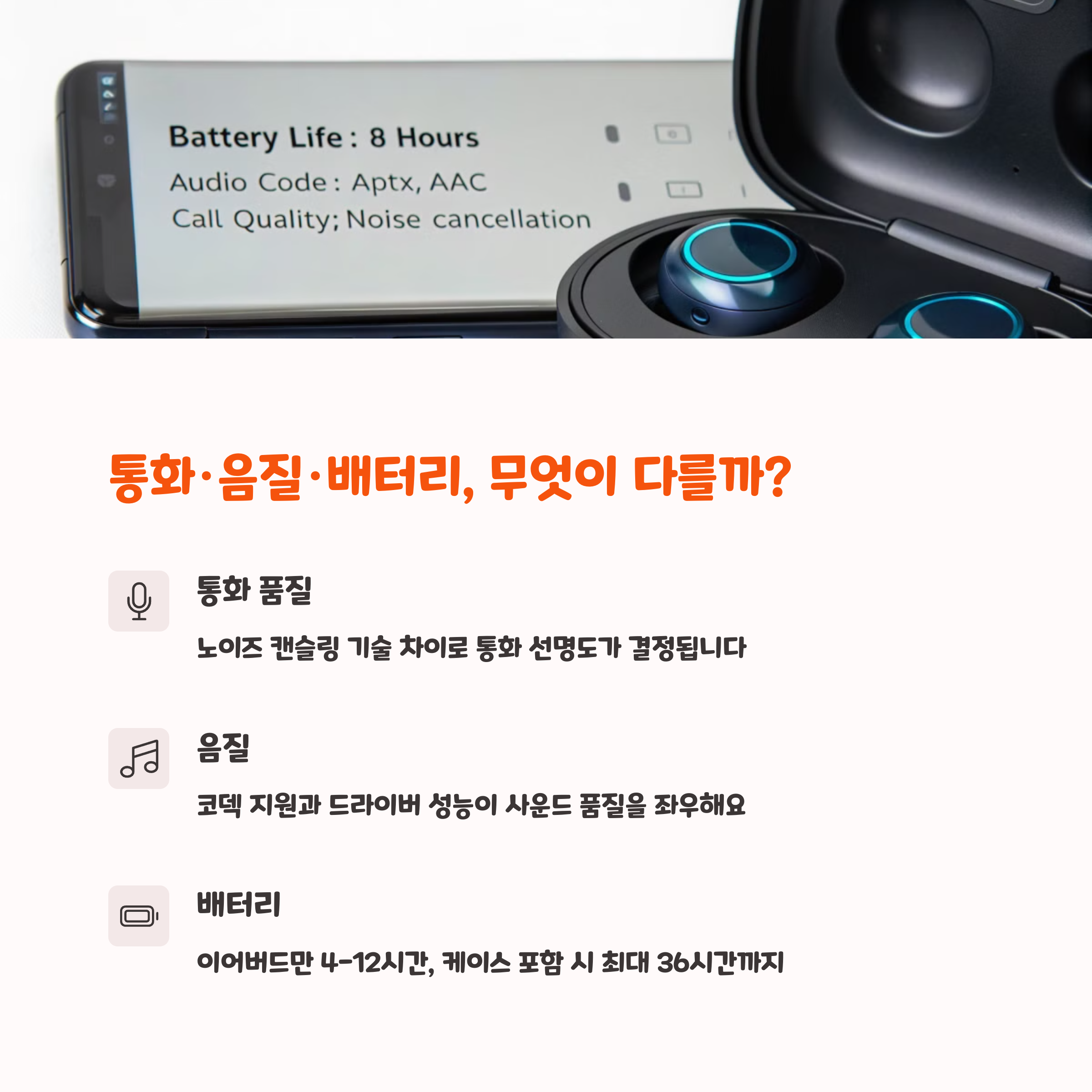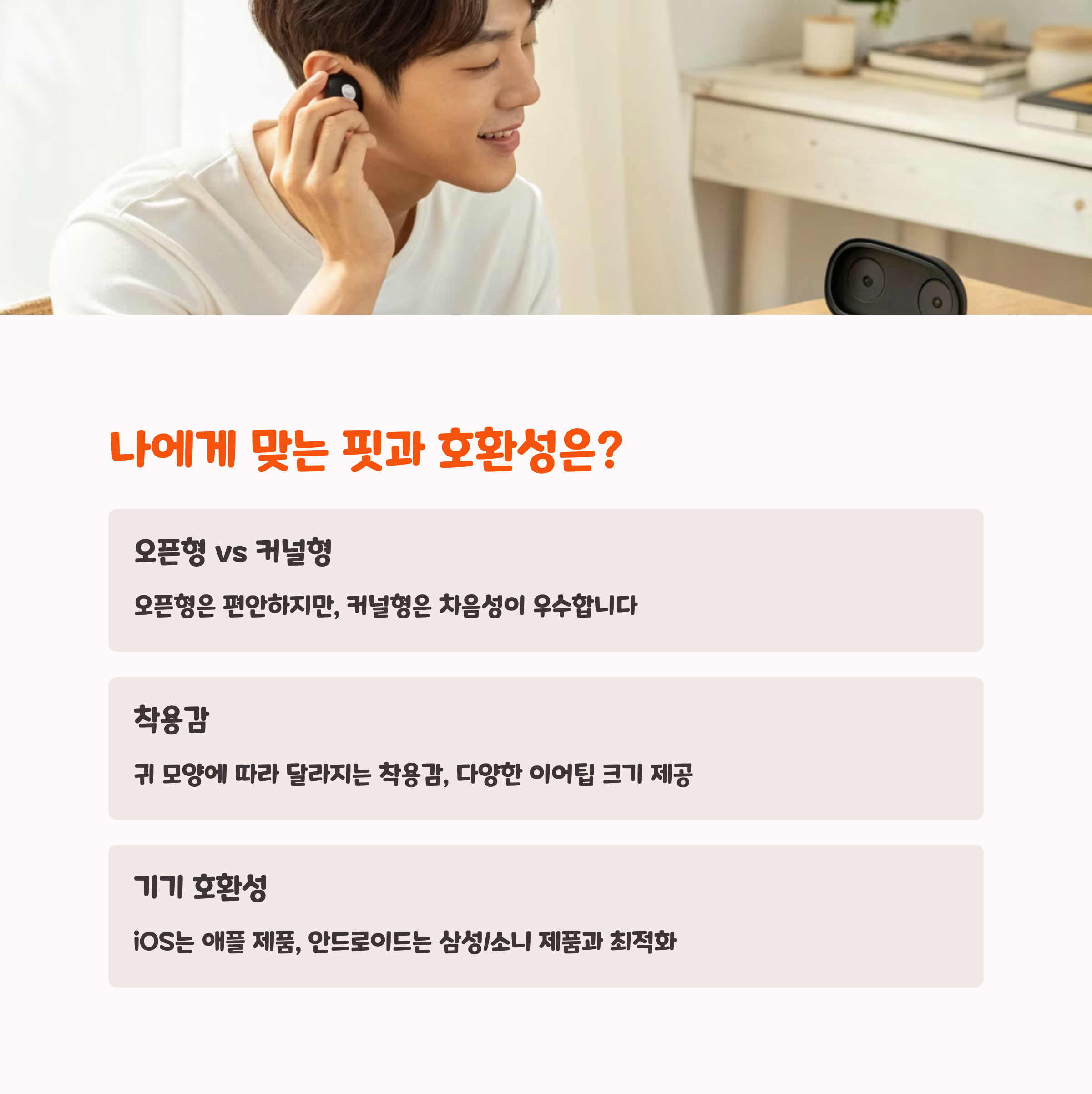 무선 이어폰은 하루에도 몇 시간씩 착용하는 만큼, ‘착용감’이 정말 중요해요. 귀에 부담이 없다든지, 귀 안에 안정적으로 고정된다든지 하는 부분이 체감 만족도를 크게 좌우하죠. 게다가 아이폰/갤럭시 등 어떤 기기와 얼마나 잘 호환되느냐도 꼭 확인해야 해요. 📱👂