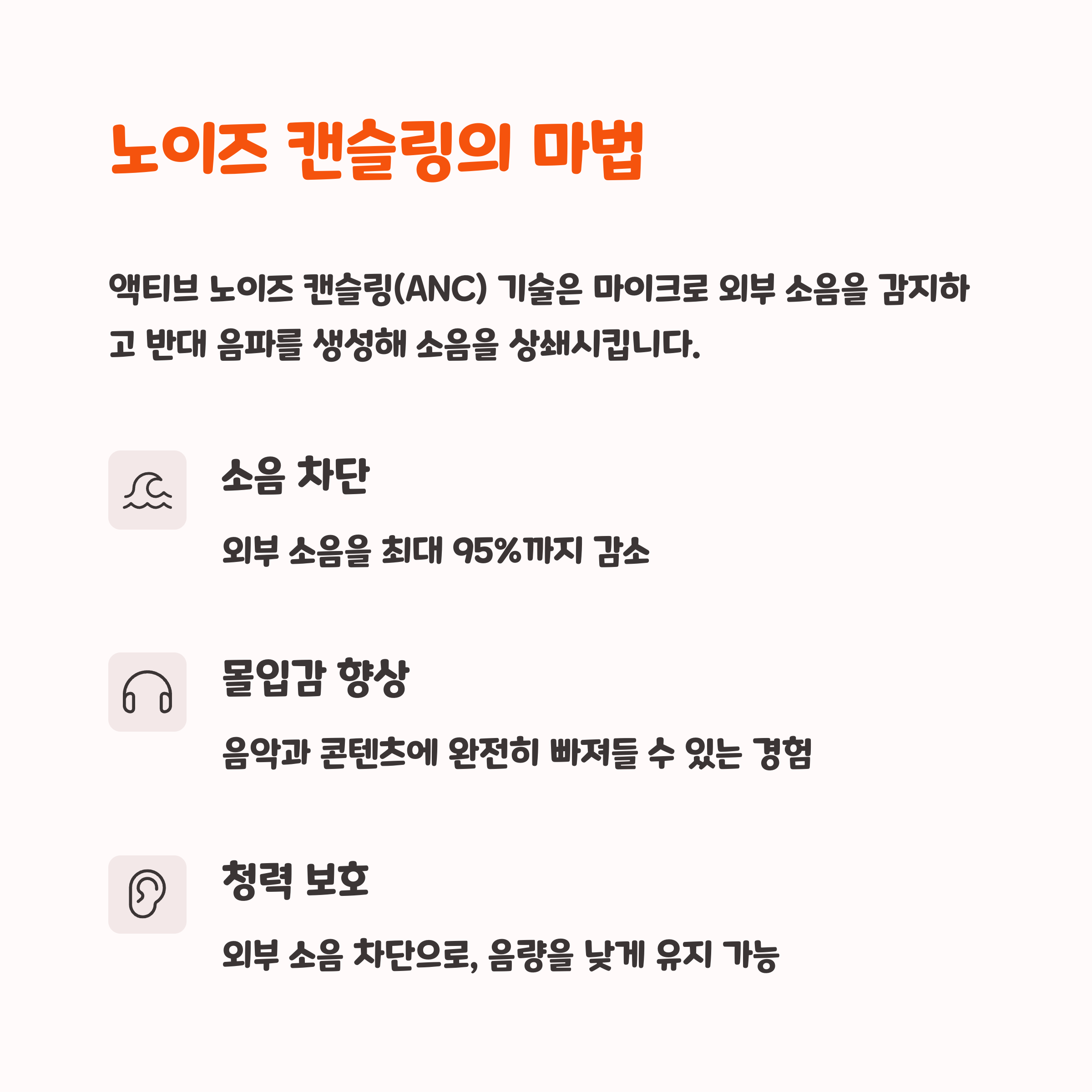 기술적으로 보면 ANC는 소리 간섭 현상을 활용한 건데, 소리를 듣지 않는 게 아니라 '듣지 않도록 만들어주는' 거라서 오히려 소리의 선명함이 올라가기도 해요. 특히 도심 속 출퇴근길이나 소음 많은 카페에서 효과가 어마어마해요.