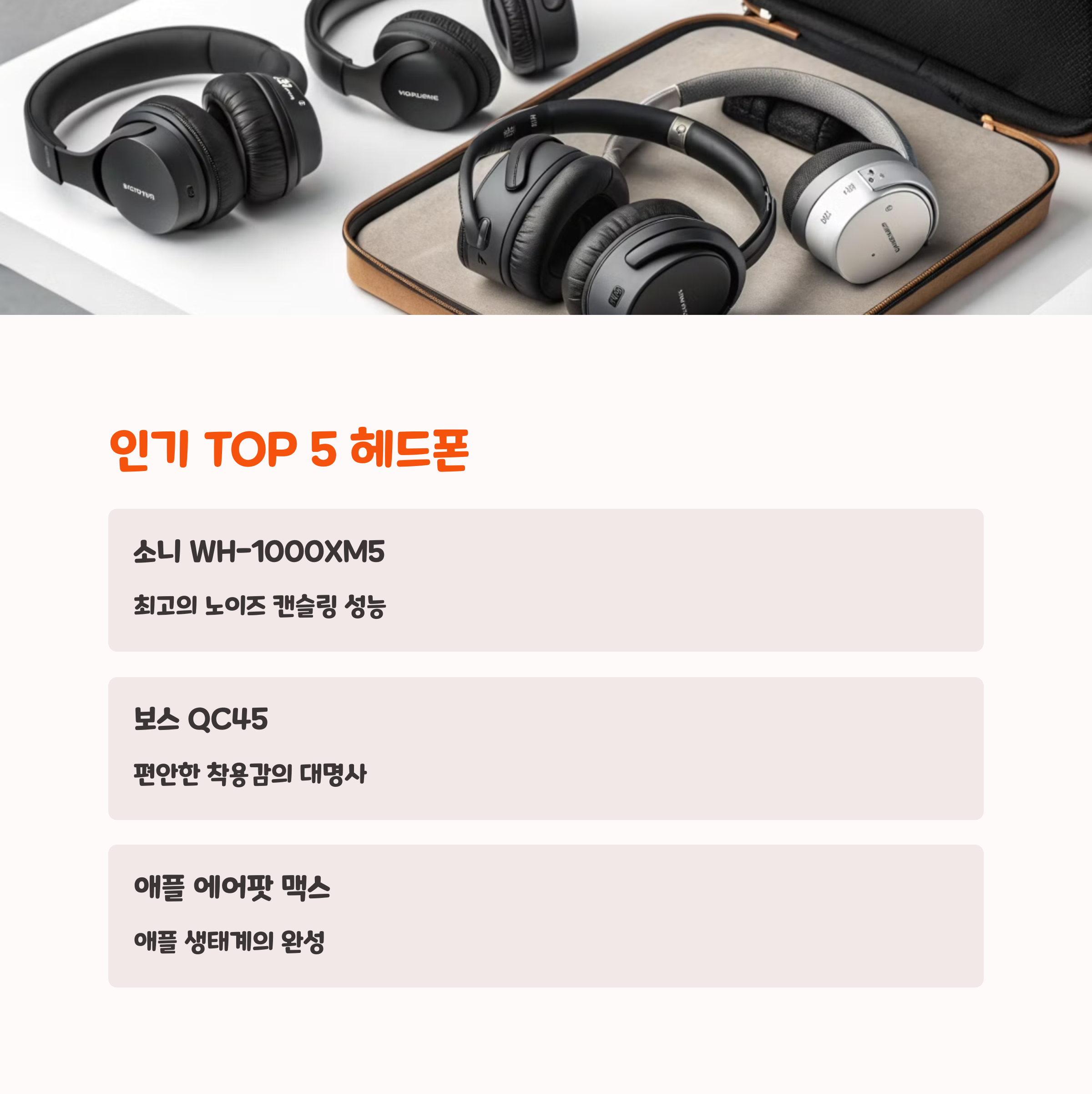 2025년 기준 가장 핫한 노이즈 캔슬링 헤드폰 TOP 5를 소개할게요! 소니 WH-1000XM5, 애플 에어팟 맥스, 보스 QC45는 꾸준한 인기 제품이고, 앤커 사운드코어 Q30과 샤오미 헤드폰은 가성비가 뛰어나서 입문자에게 추천돼요.