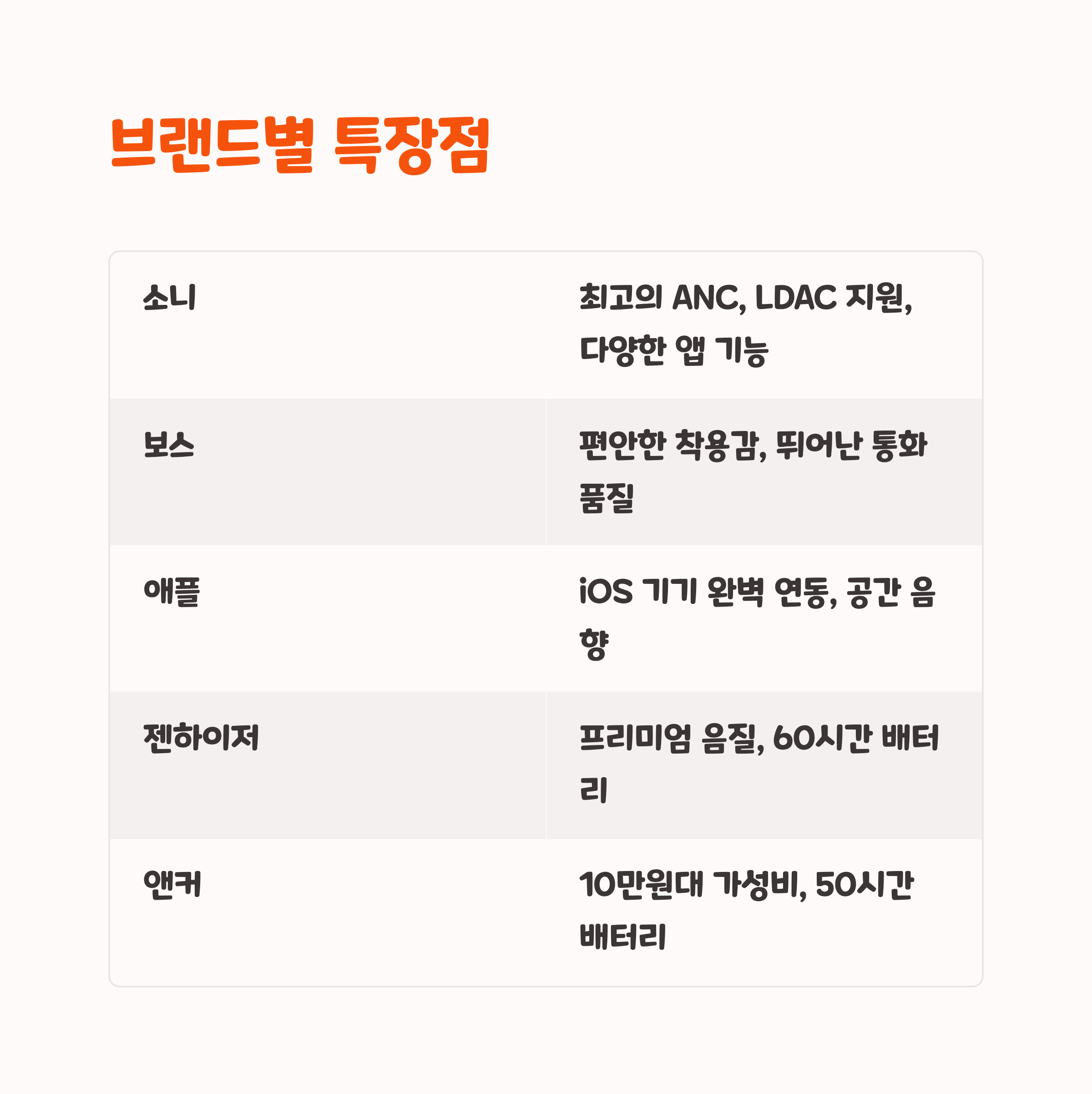 제품을 선택할 때 중요한 포인트는 배터리 수명, 착용감, 소음 차단력, 음질, 무게예요. 아래 비교표를 참고하면 훨씬 쉽게 선택할 수 있을 거예요 👍