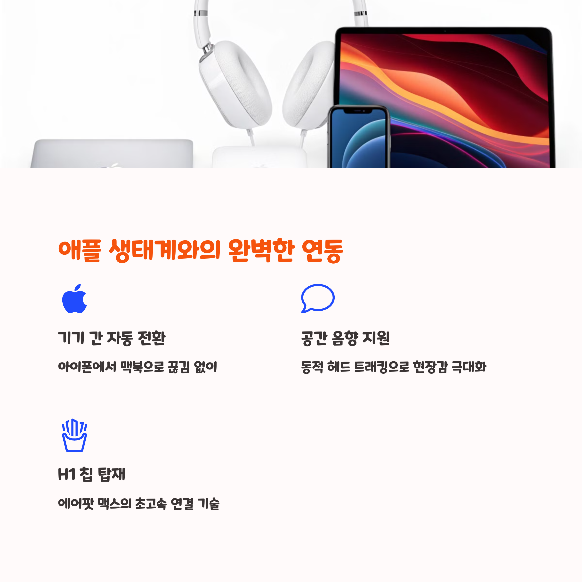 하지만 애플 기기를 적극적으로 사용하는 분이라면 얘기가 달라져요. H1 칩 기반 연동, 공간 음향, 생태계 자동 전환 같은 기능은 오직 에어팟 맥스에서만 경험할 수 있는 것들이거든요.
