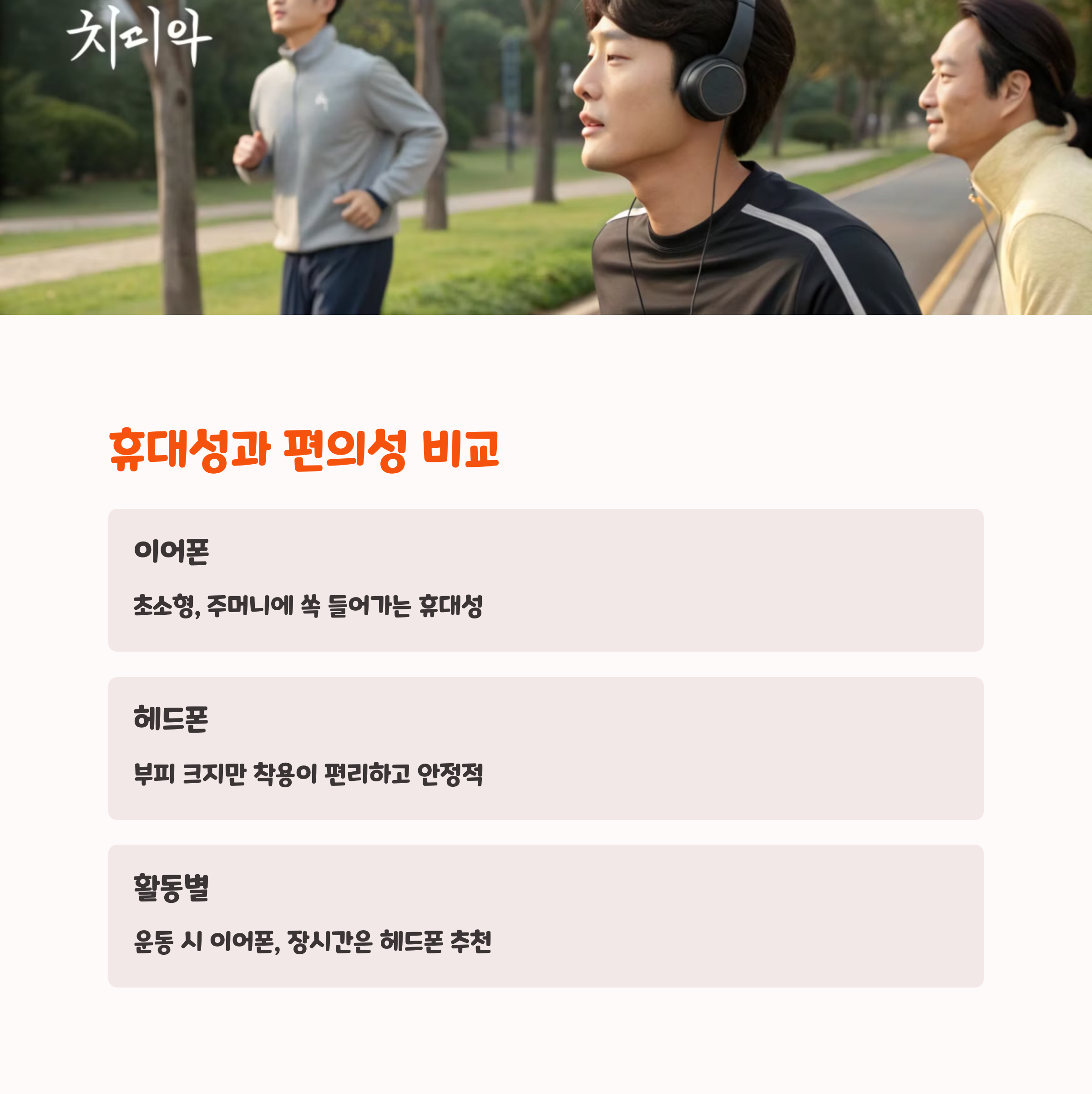 결론적으로 ‘간편한 휴대성’에서는 이어폰이 우위, ‘집중감 있는 편안함’은 헤드폰이 우위예요. 출퇴근길 짧은 구간에선 이어폰, 도서관에서 장시간 몰입할 땐 헤드폰이 잘 맞는 조합이에요.
