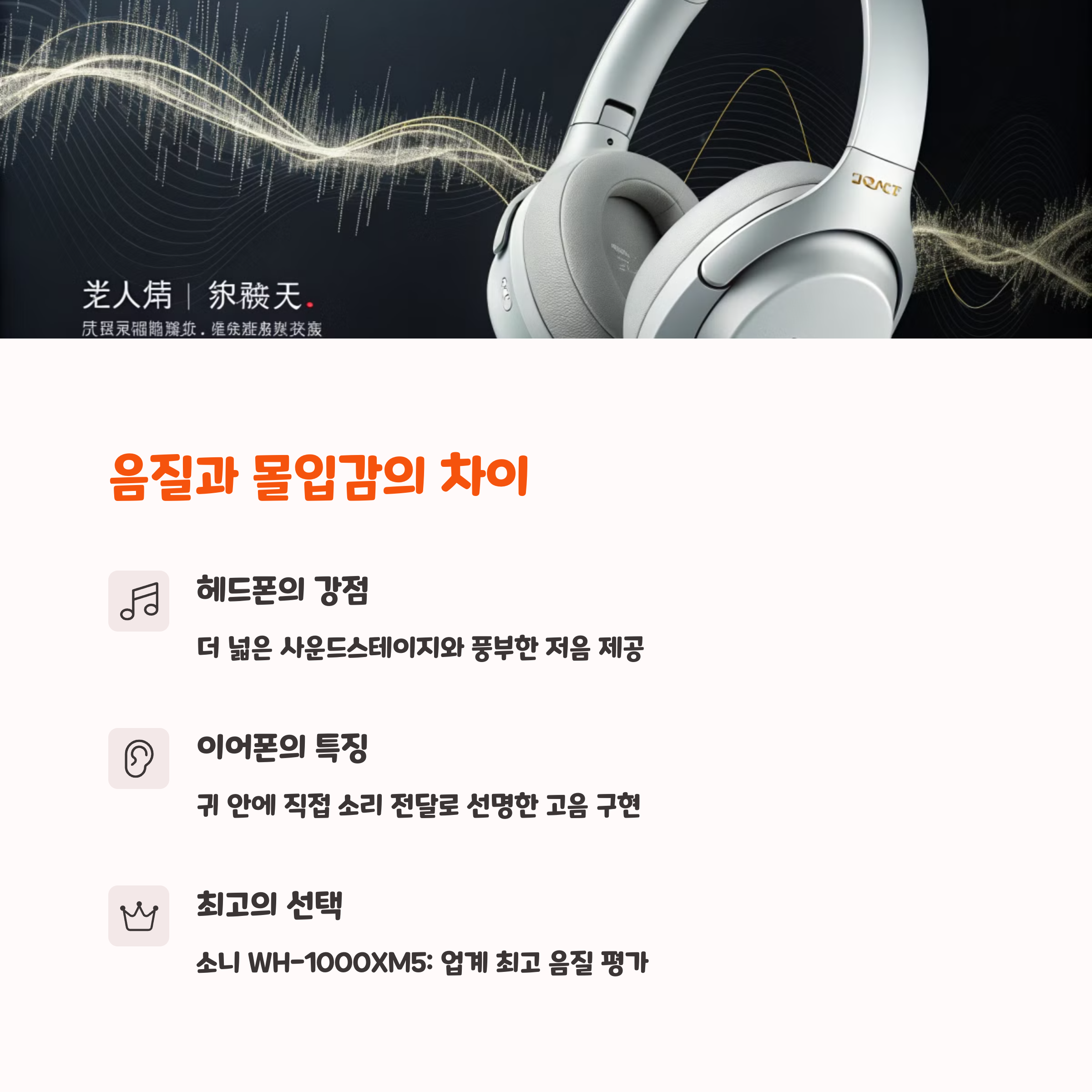 결론적으로 '몰입형 사운드'와 '음장감'은 헤드폰이 한 수 위, 반면 ‘섬세하고 귓속에 꽉 찬 사운드’는 이어폰이 유리하다고 볼 수 있어요. 청취 장르에 따라 선택이 달라지는 부분이에요.