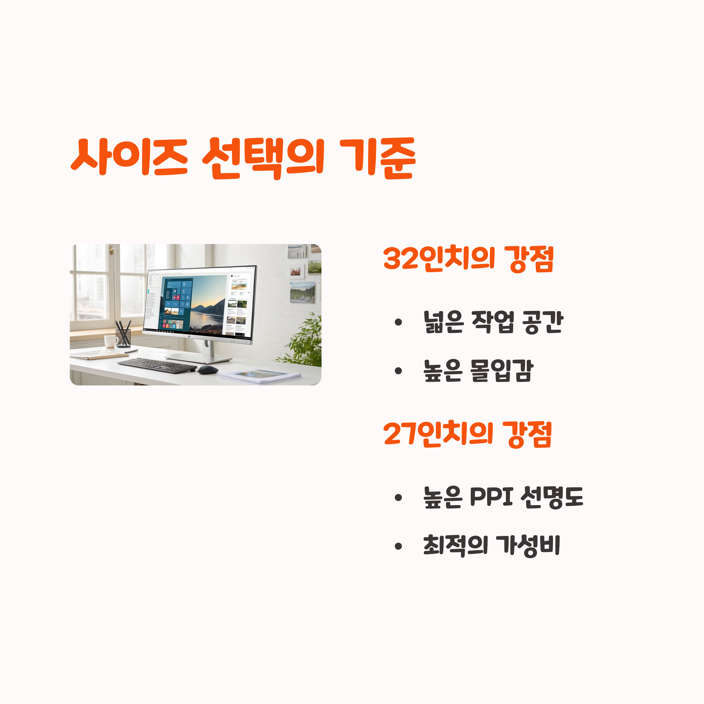 결론적으로 책상 공간, 시청 거리, 작업 스타일에 따라 선택이 달라져요. 무조건 크다고 좋은 것도, 작다고 불리한 것도 아니랍니다! 🎯