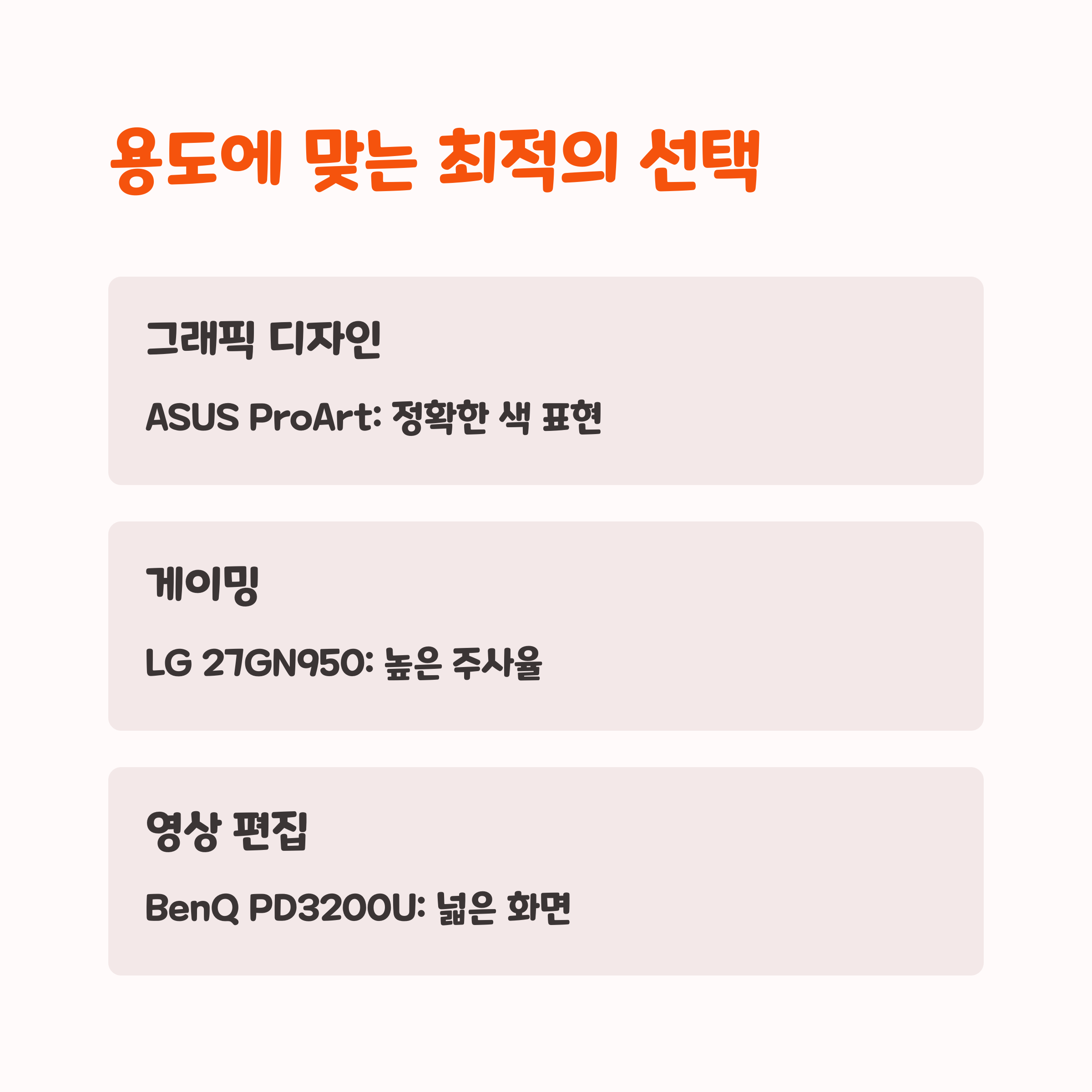 | LG 32UN650 | 32" | 3840x2160 | IPS | 영상편집, 업무 | 50만 원대 |