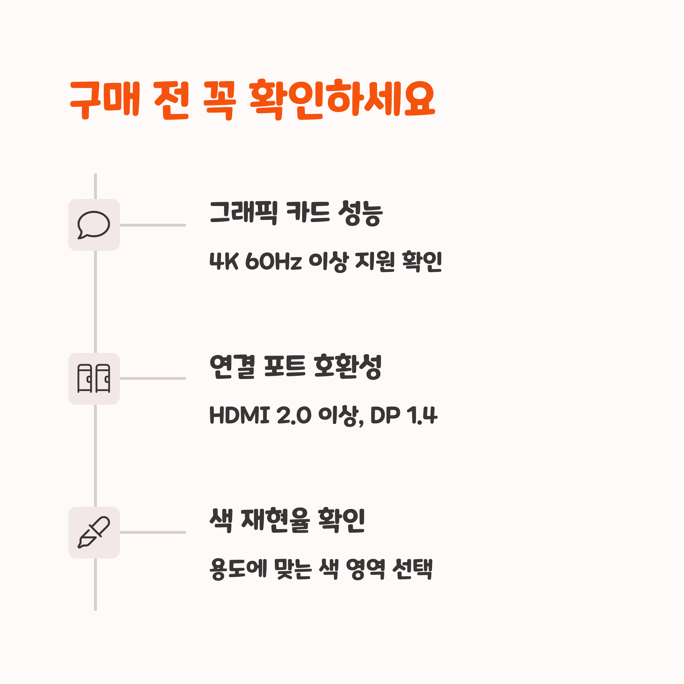 ✅ 포트 구성 확인 HDMI 2.0 이상, DP, USB-C가 있는지, 전원 일체형인지 확인해요.