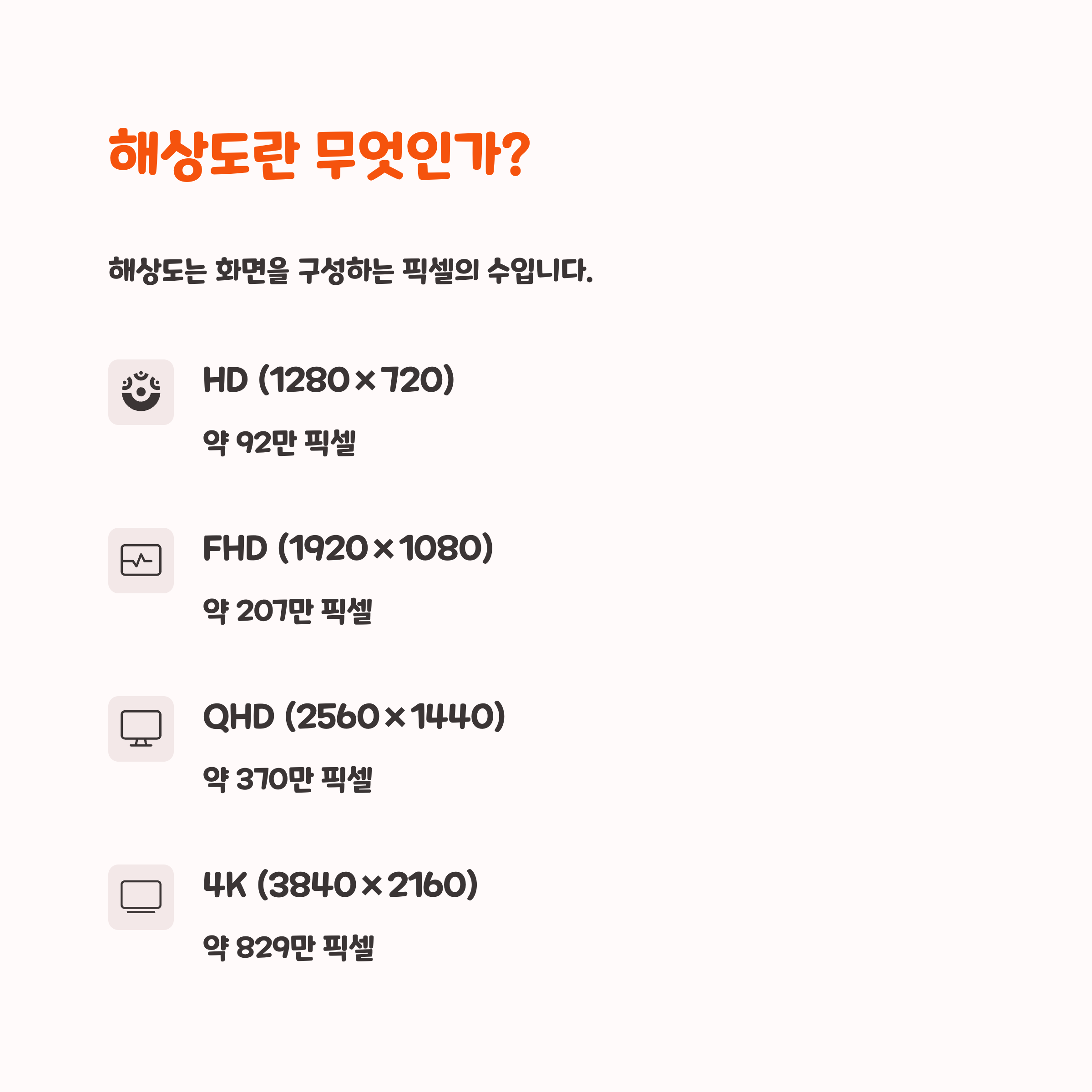 우선 해상도는 화면에 표시되는 ‘픽셀 수’를 의미해요. FHD(1920x1080), QHD(2560x1440), 4K UHD(3840x2160) 순으로 높아지죠. 해상도가 높을수록 더 많은 정보가 선명하게 표시돼요.
