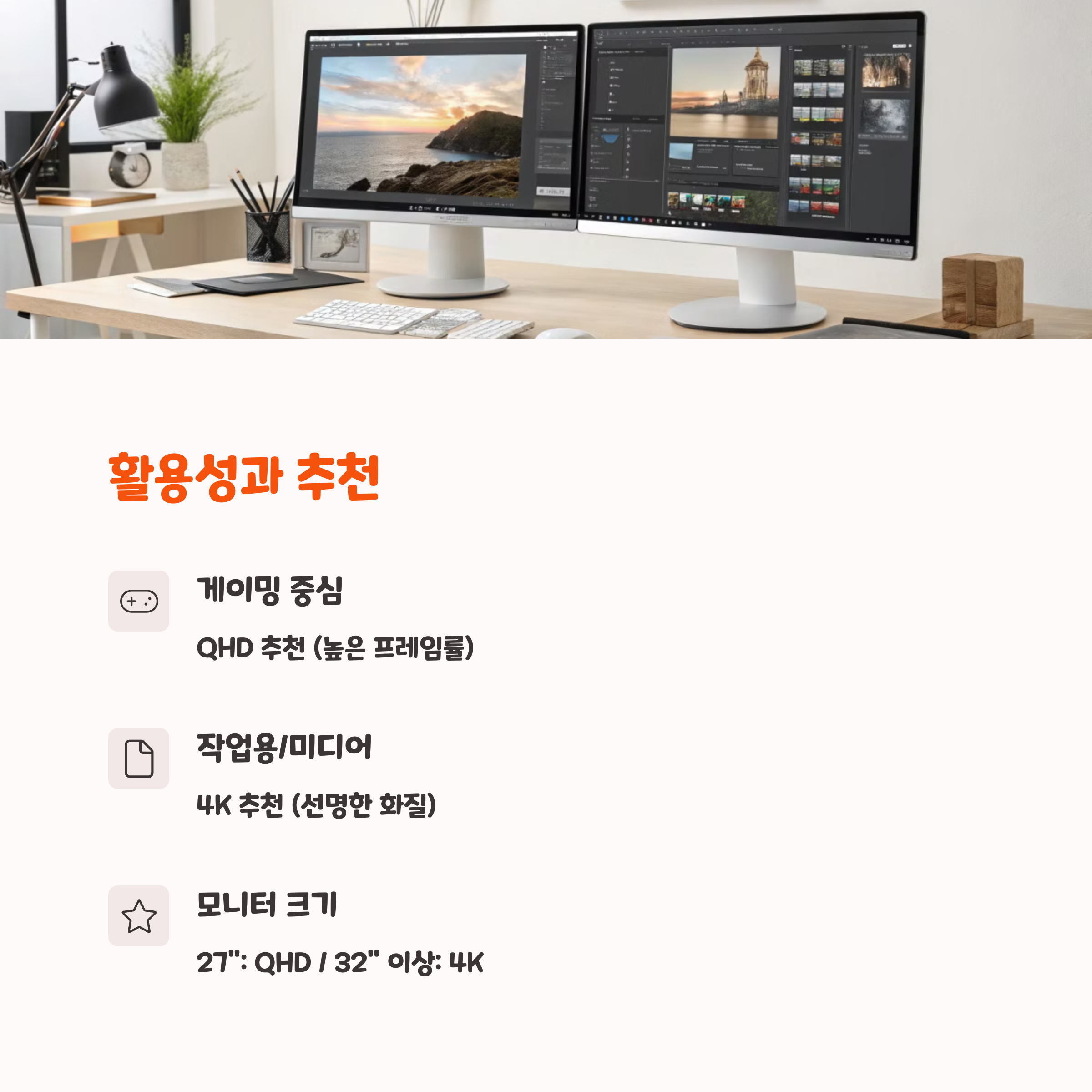 QHD 모니터는 게임 외에도 영상 감상, 사무 작업, 멀티태스킹에 적당한 해상도예요. 텍스트 가독성도 좋고, GPU 부담이 적어 다용도로 쓰기 좋아요.