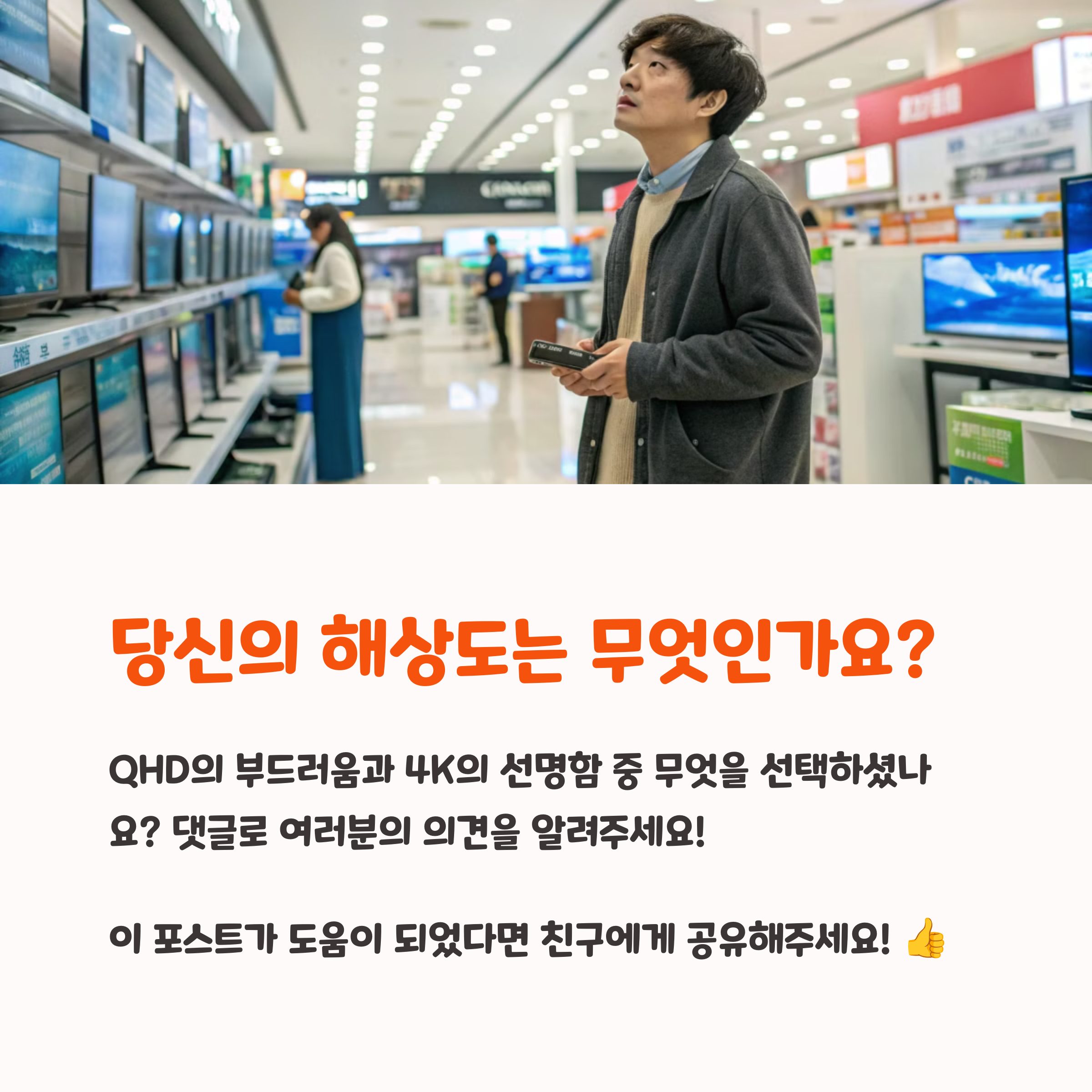A1. 프레임과 반응 속도가 중요하다면 QHD, 몰입감과 화질이 중요하다면 4K가 적합해요.