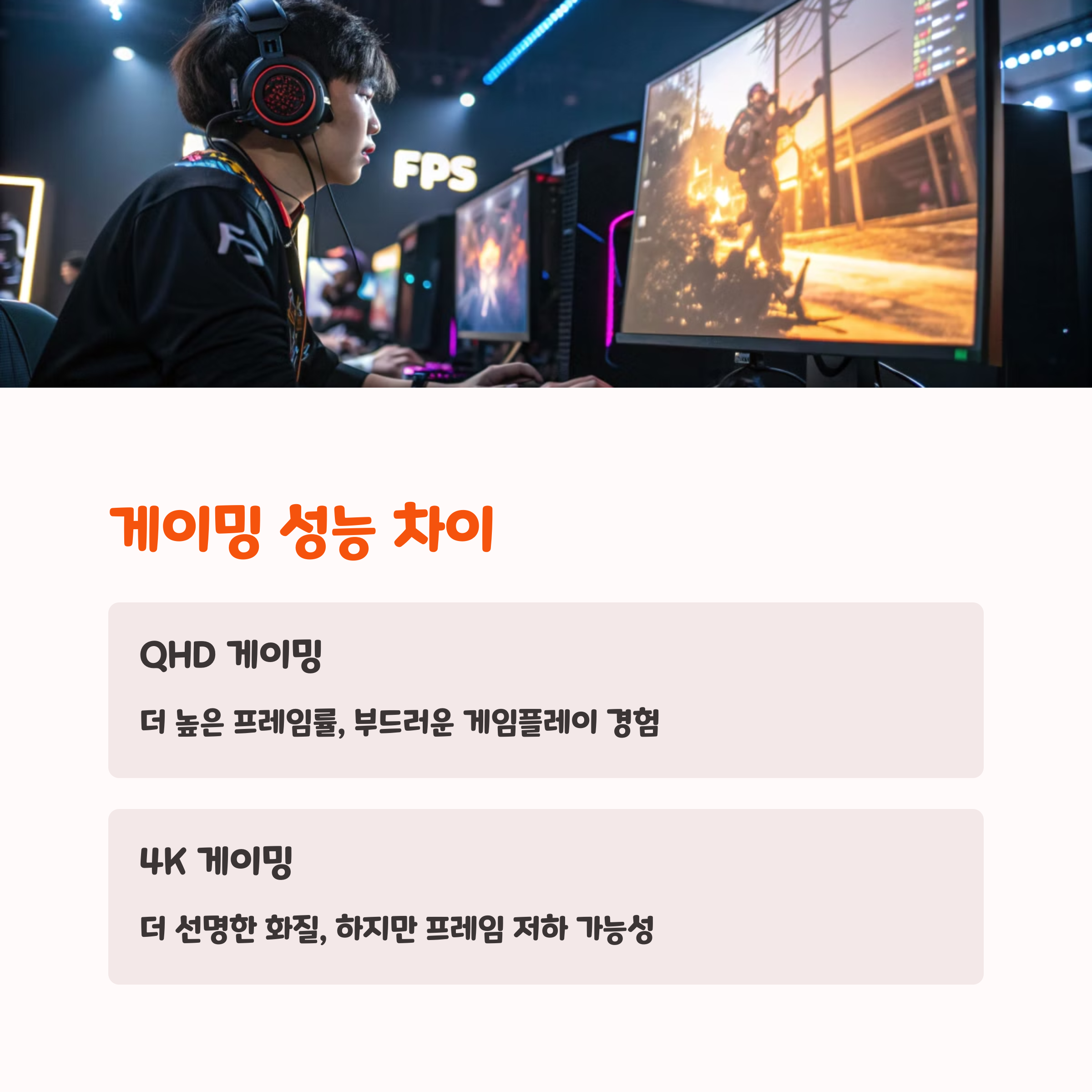 FPS, 배틀로얄 위주 → QHD 고주사율 싱글 그래픽 몰입 게임 + 영상 작업도 한다면 → 4K가 최고예요!