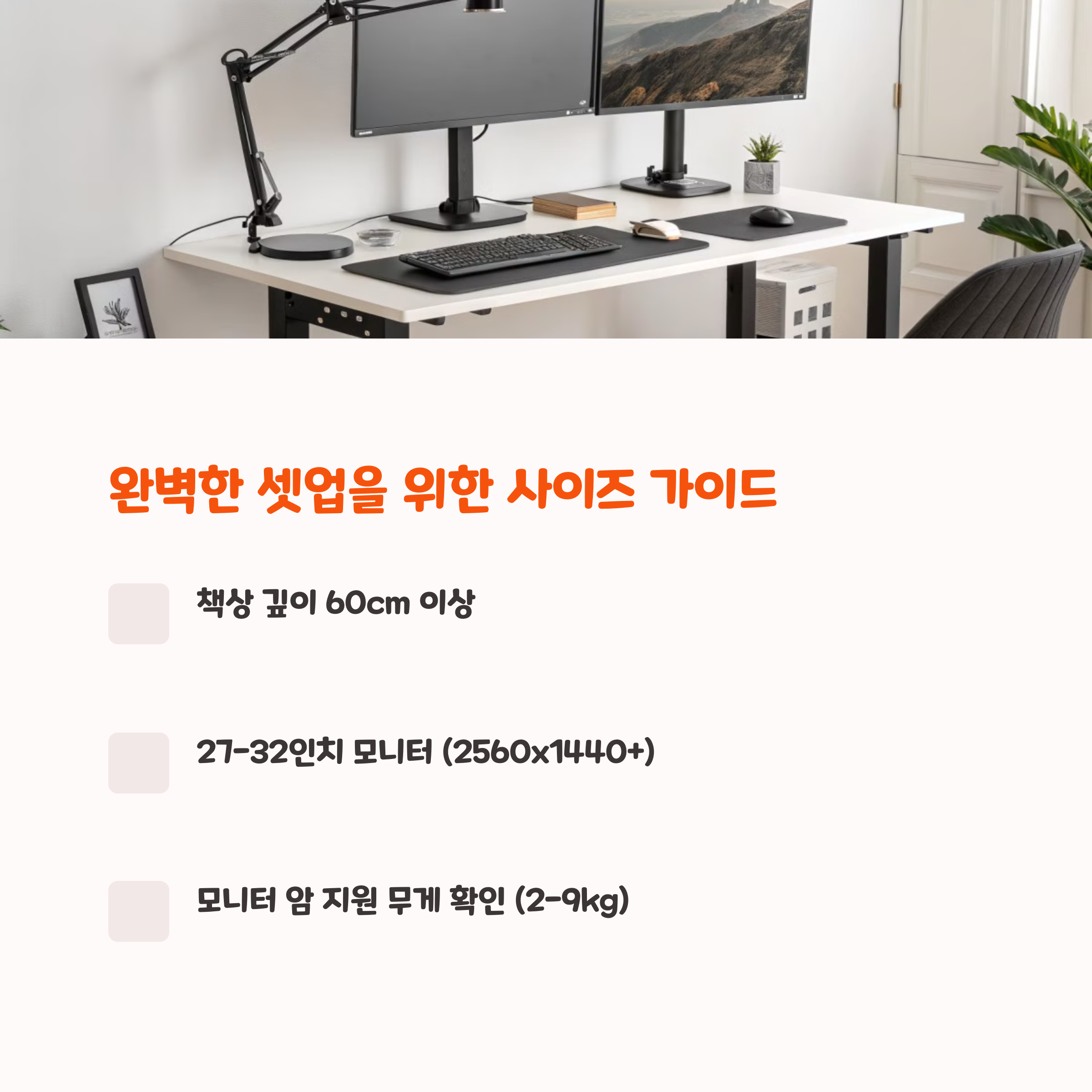 📏 듀얼 모니터 셋업을 할 땐 책상 사이즈를 꼭 체크해야 해요. 27인치 모니터 2대를 가로로 배치하면 최소 120cm, 여유롭게 하려면 140~160cm 책상이 적당해요.