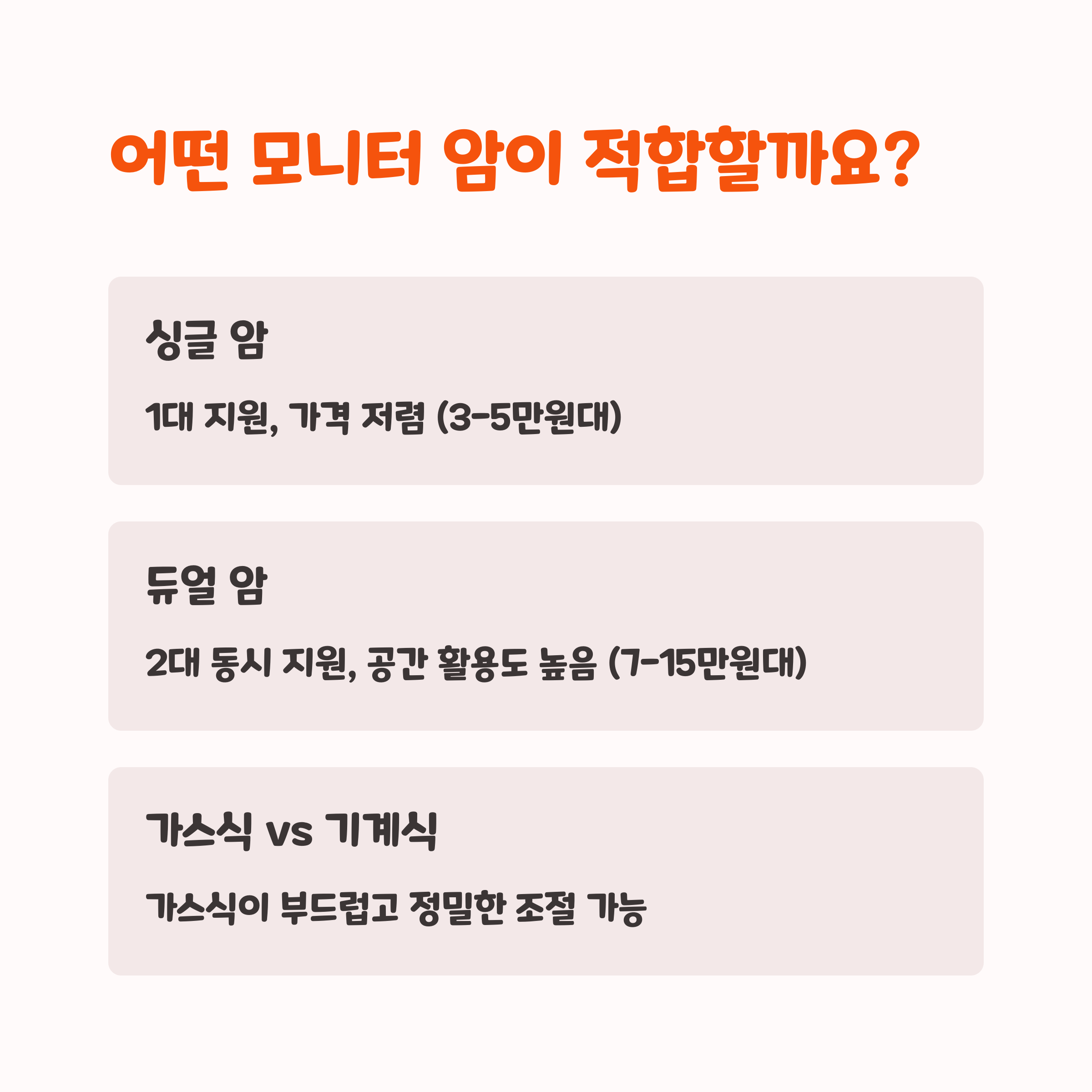 암을 선택할 땐 모니터 무게, 사이즈, 책상 두께(클램프 가능 여부), 피벗 기능 필요성 등을 함께 고려해야 해요. 특히 32인치 이상 고중량 모니터라면 고하중용 암으로 선택하세요.