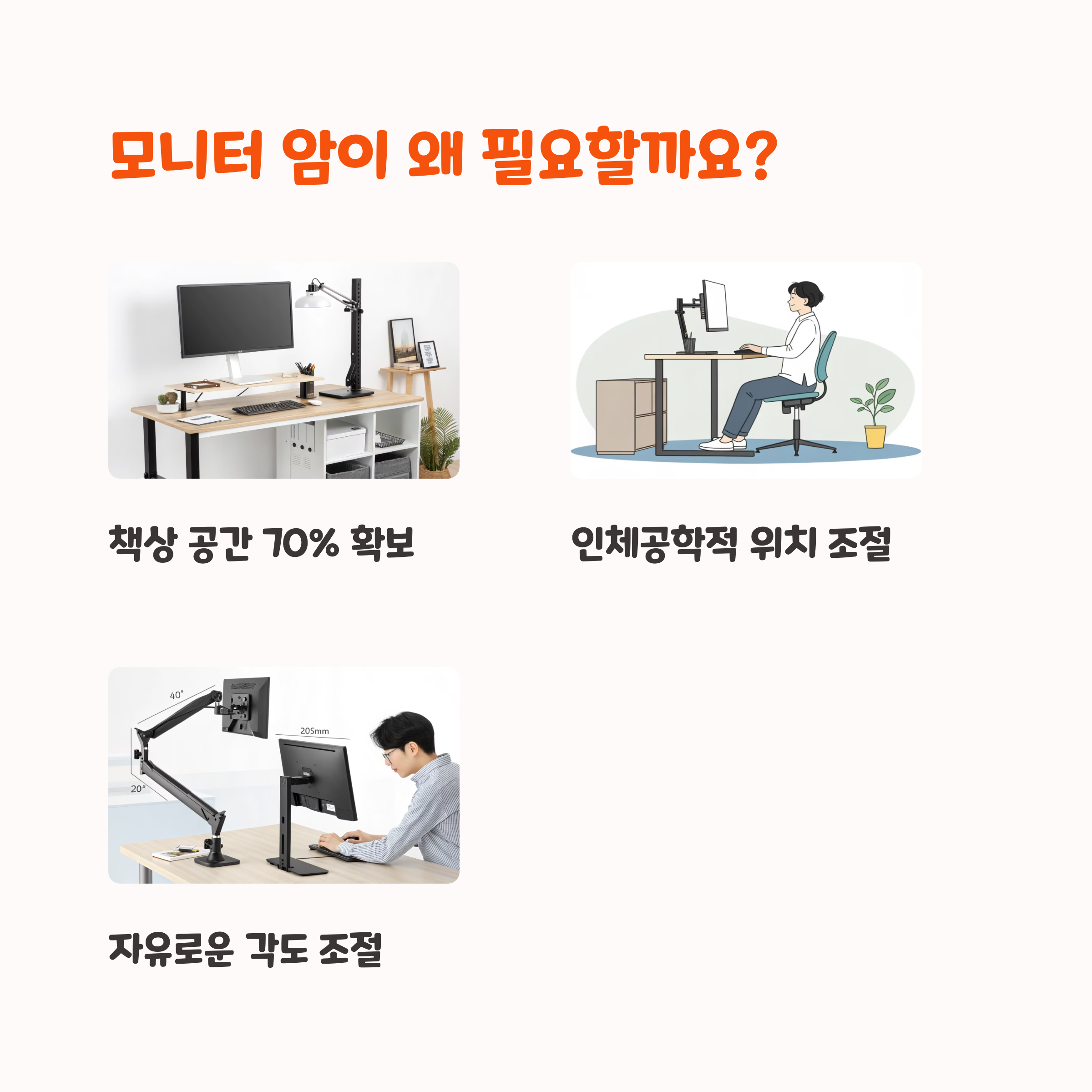 모니터 암은 단순한 액세서리가 아니라, ‘공간 확보’와 ‘목 건강’을 위한 최적의 데스크 셋업 도구예요. 암을 쓰면 화면을 눈높이에 맞게 조절할 수 있어 거북목, 승모근 통증을 줄일 수 있어요.