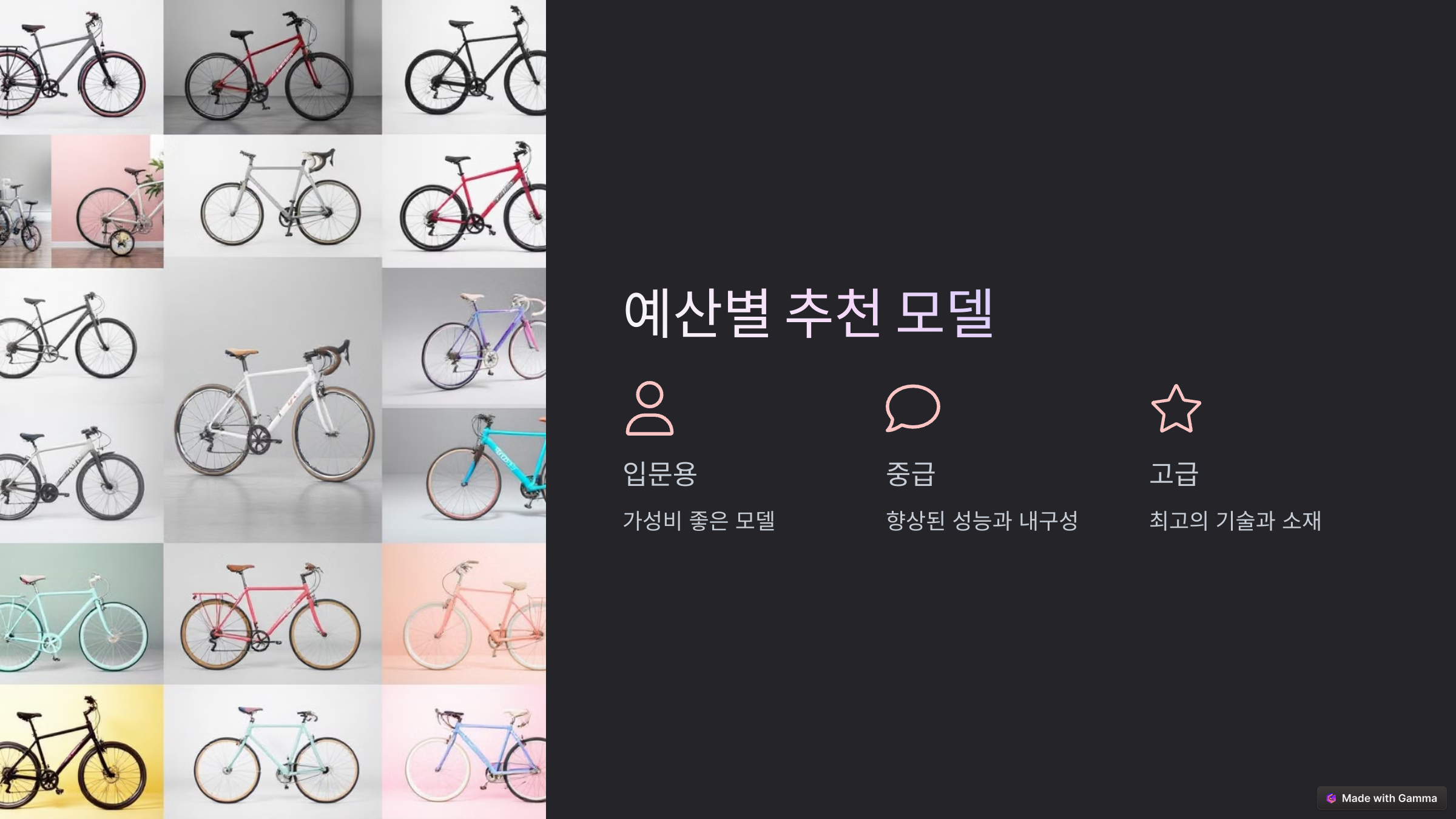 ✔️ 200만 원 이상 : 경량 프레임 & 고급 부품 사용, 레이싱 & 장거리 투어링 가능.