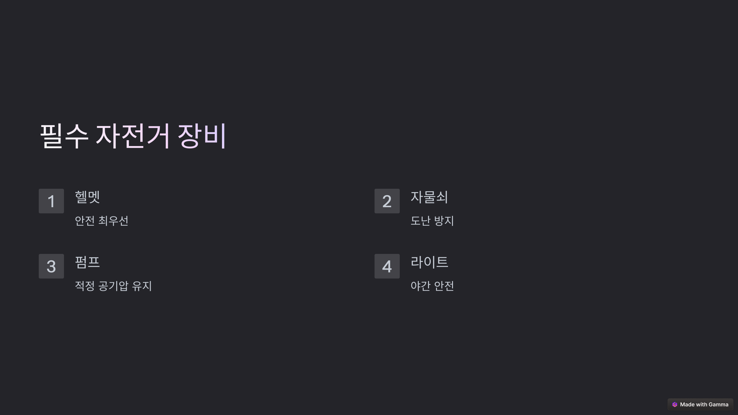 A3. 헬멧, 장갑, 라이트(전조등 & 후미등), 펌프, 자물쇠, 휴대용 공구 는 필수예요. 특히 헬멧과 라이트는 안전을 위해 반드시 챙기세요! 🛡️